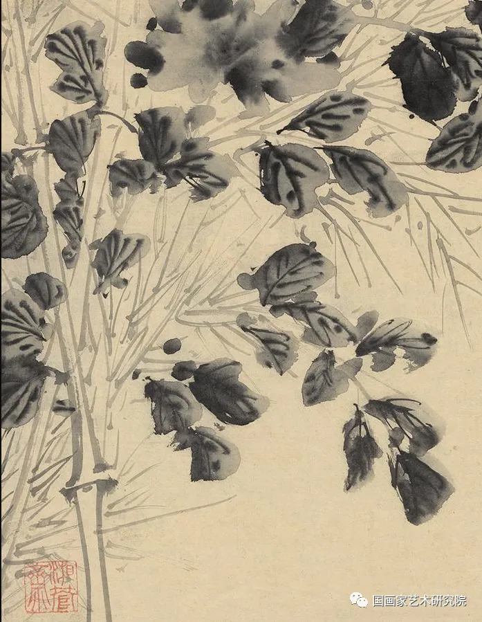 双钩墨竹与没骨牡丹穿插辉映,层次分明,虚实相生,纯以水墨写意为之,用笔狂放,构图精巧,水墨淋漓,笔墨变化多端,泼墨、焦墨、破墨、双勾并用,相互穿插呼应,挥笔如风驱墨,如云般一气呵成。