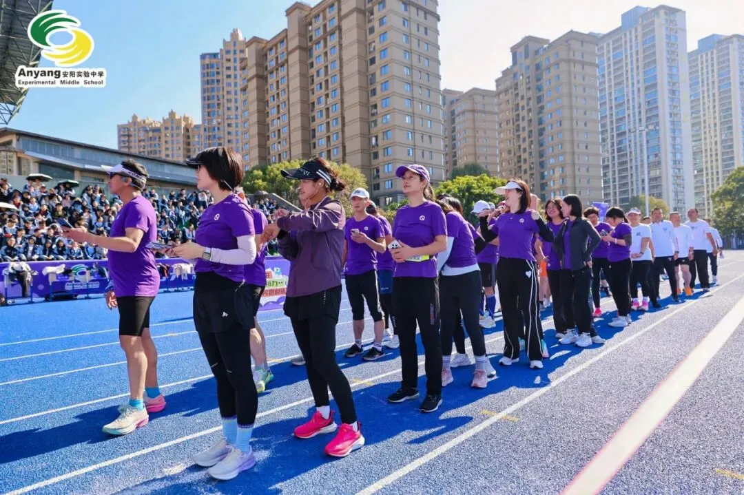 赛前,教师家长助力跑如期开跑。统一的紫色战衣,衬出教师团队的昂扬锐气;洁白的加油短袖,映现家长后援团的暖心底色。