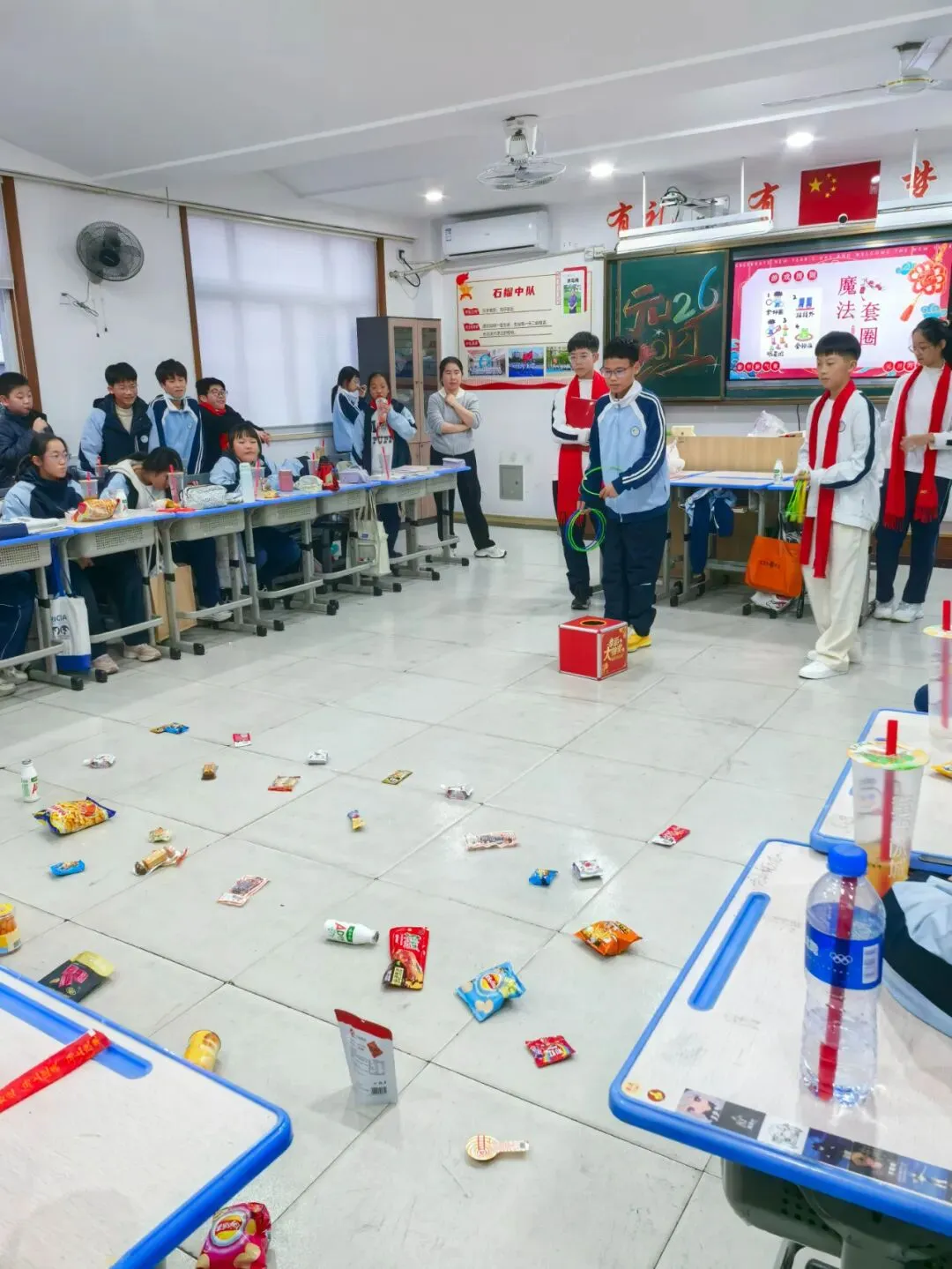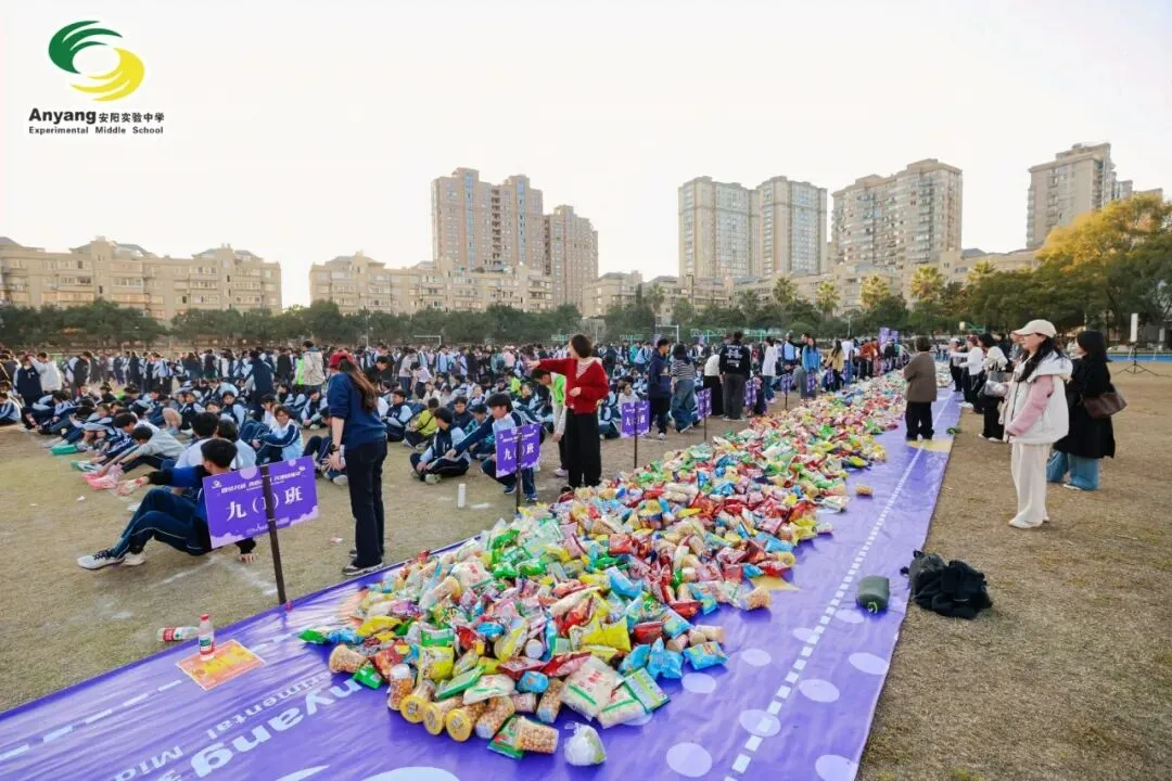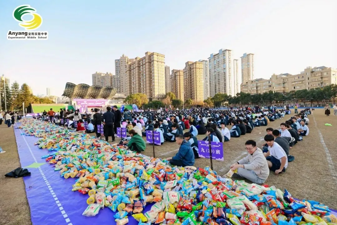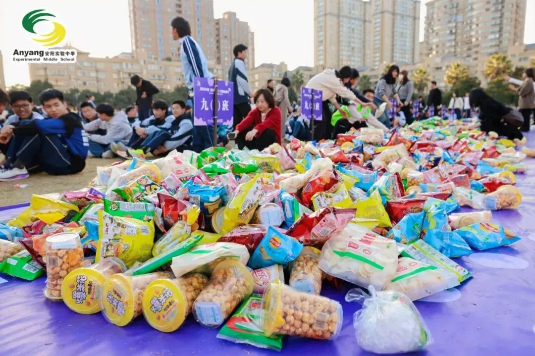 赛后,九年级抢零食大战一触即发。各班的零食搬运流水线早已整齐排布在操场之上。谁能“抱得零食归”,全凭各班实力。大战正式打响!班主任身先士卒,筑防线、搬零食。同学们各显身手,争分夺秒将零食运入宝箱。一场热火朝天的“零食争夺战”,在欢声与笑语中圆满落幕。
