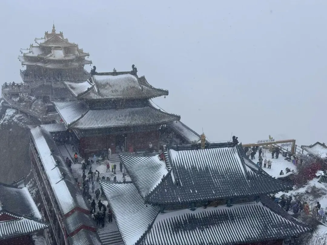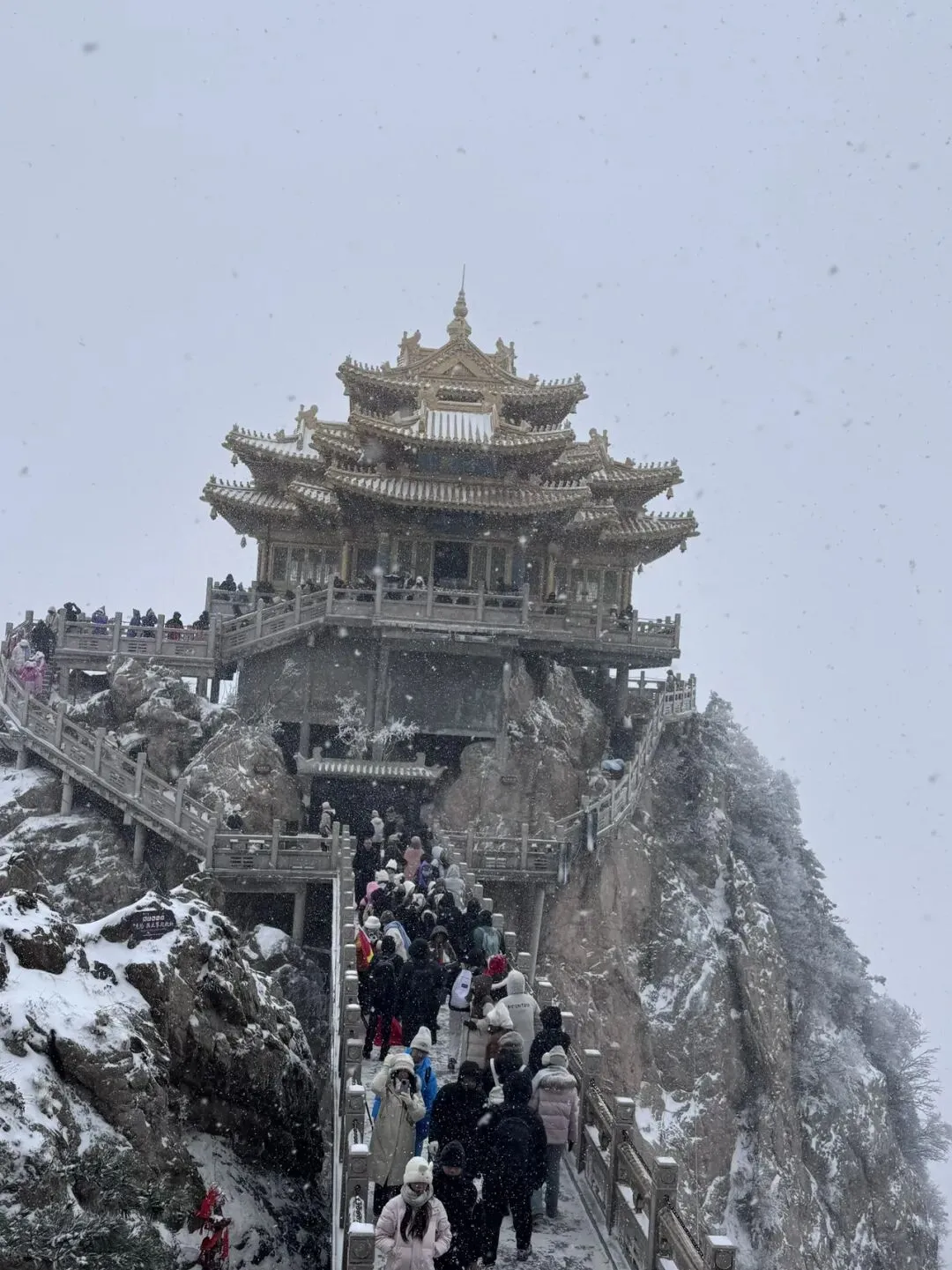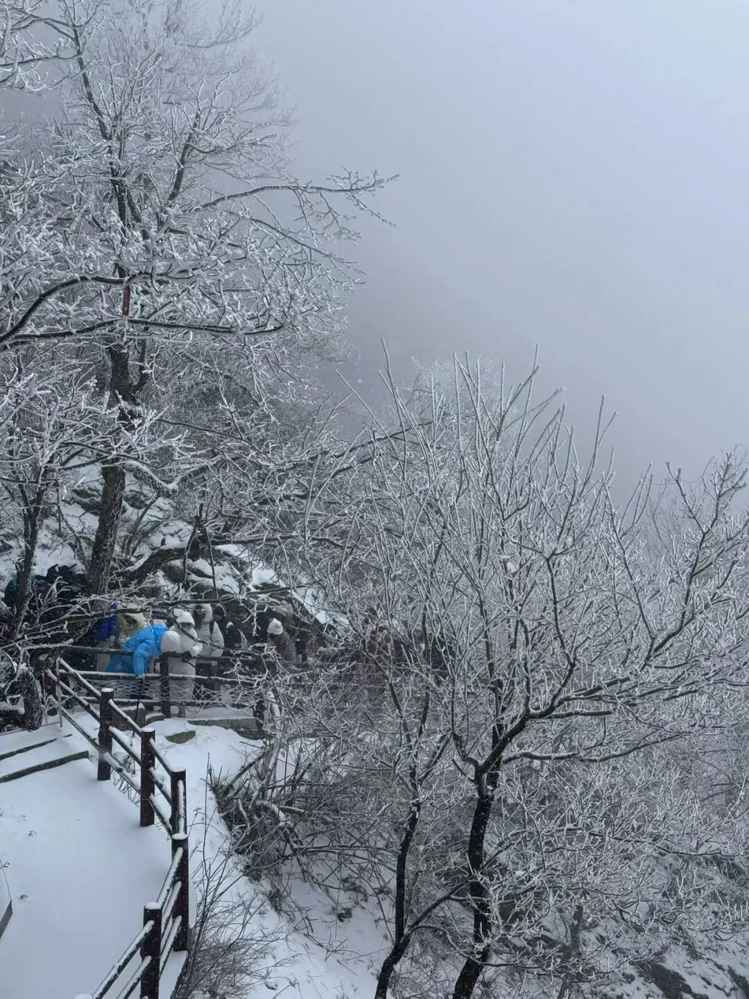 我报的一日游团包含往返路费、门票和第一道索道费用,性价比很高。出发途中就看到雪花飘落,山间已有积雪,抵达目的地时,眼前的雪景更是让我震撼。雪中爬山的心愿我藏了三四年,这次总算实现了。