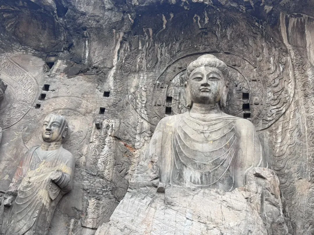 进园后我先参观西山石窟,这里是龙门石窟的精华所在,我大概游览了两个多小时。依次参观了宾阳三洞(可惜有2个洞窟已被围起来保护,无法近距离观看)、万佛洞等景点,之后沿着长长的石阶登上卢舍那大佛所在的平台。一见到卢舍那大佛,我就被它震撼到了——大佛的微笑庄严而温和,不同角度观看,神态还略有不同。这里的石雕作品都透着唐代的繁荣昌盛之气,极具艺术感染力。