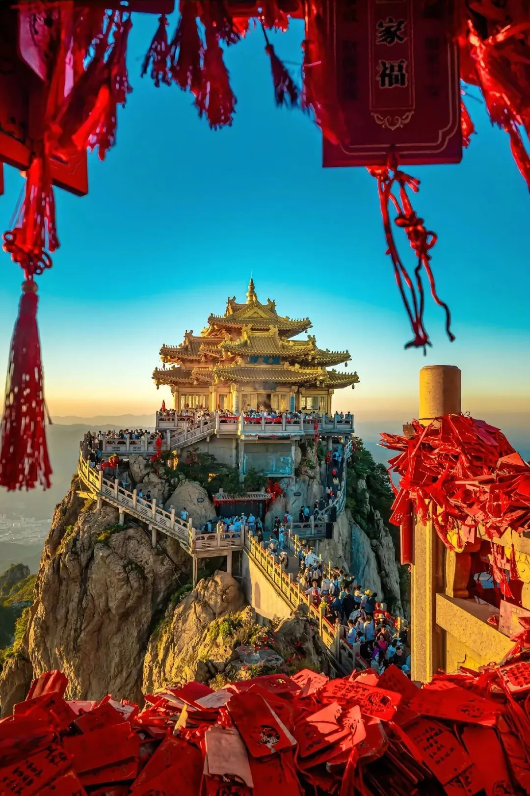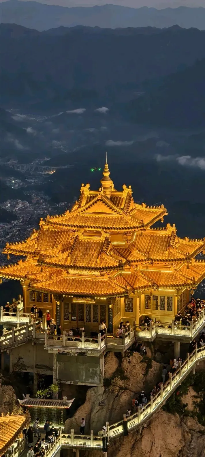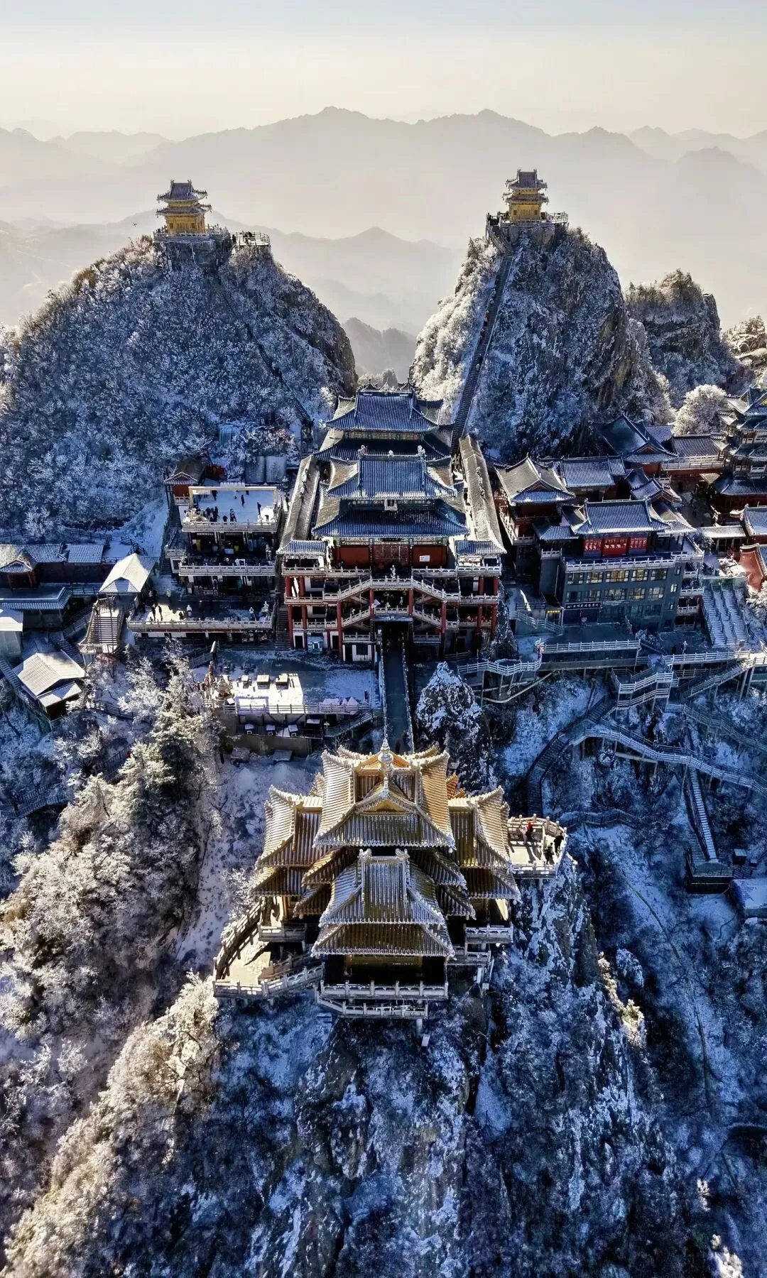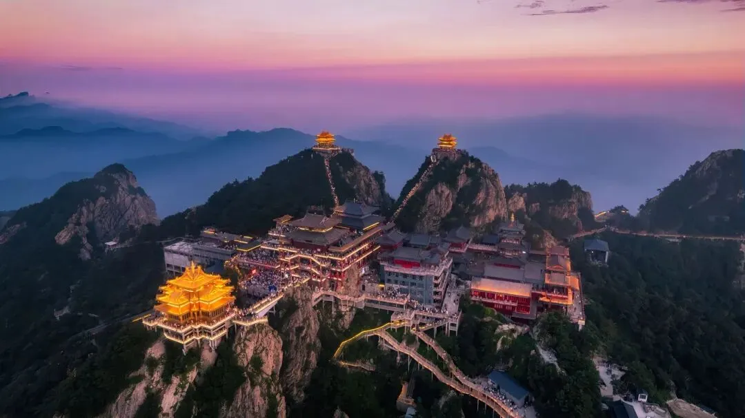 金顶道观群 无疑是老君山的灵魂所在。由金殿、亮宝台、玉皇顶、五母金殿等建筑组成的建筑群,在阳光照射下金光熠熠。