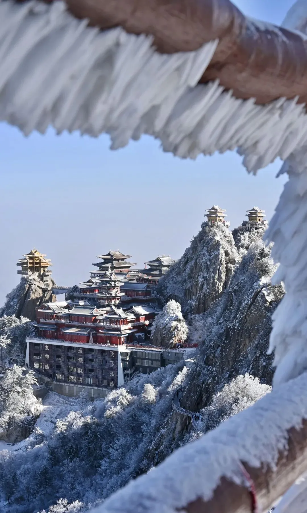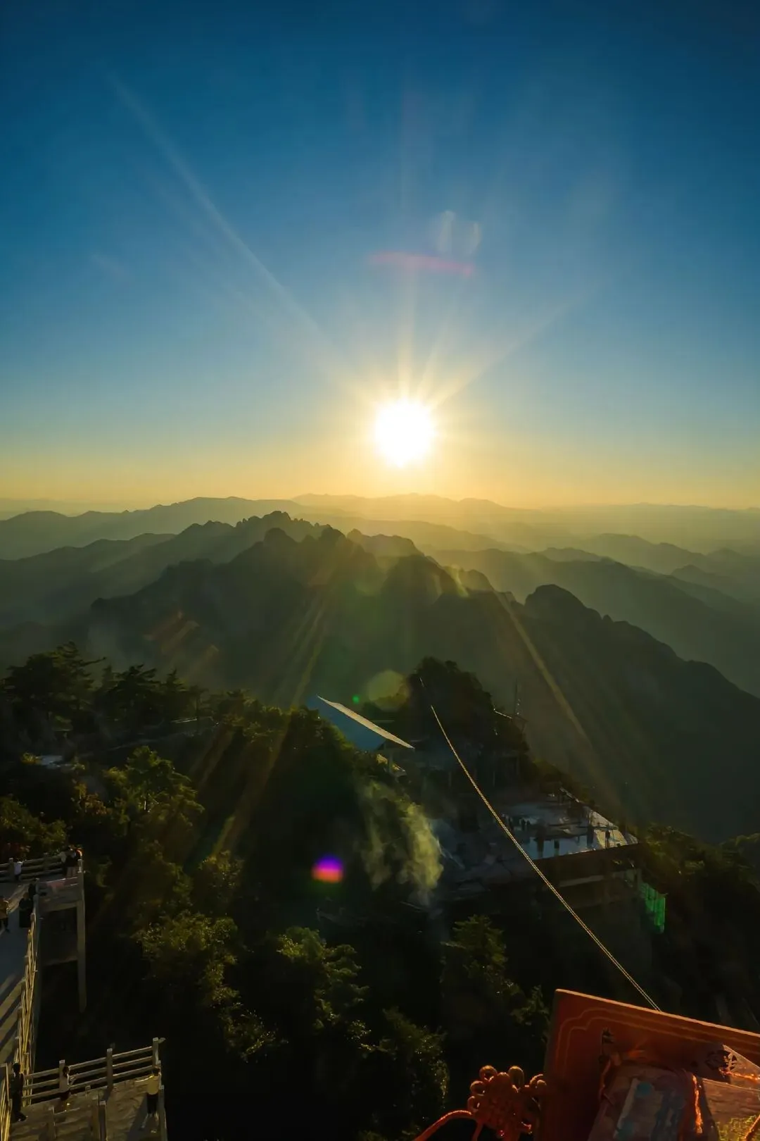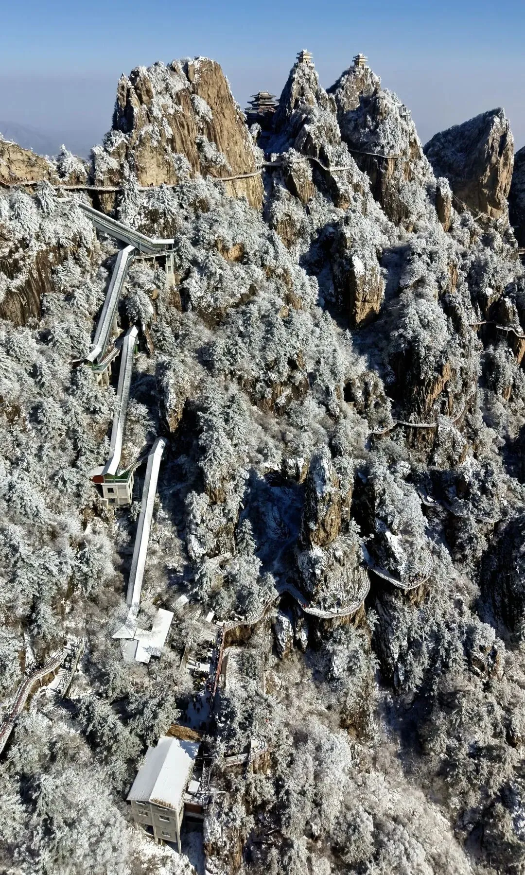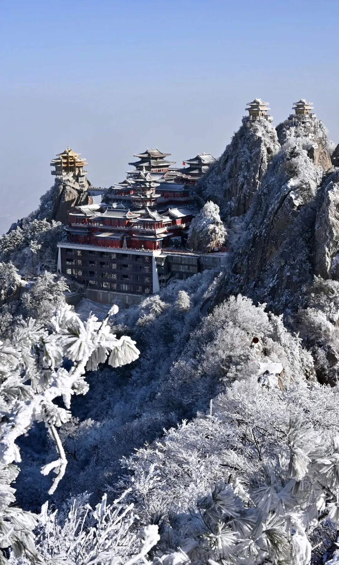 金顶道观群 无疑是老君山的灵魂所在。由金殿、亮宝台、玉皇顶、五母金殿等建筑组成的建筑群,在阳光照射下金光熠熠。