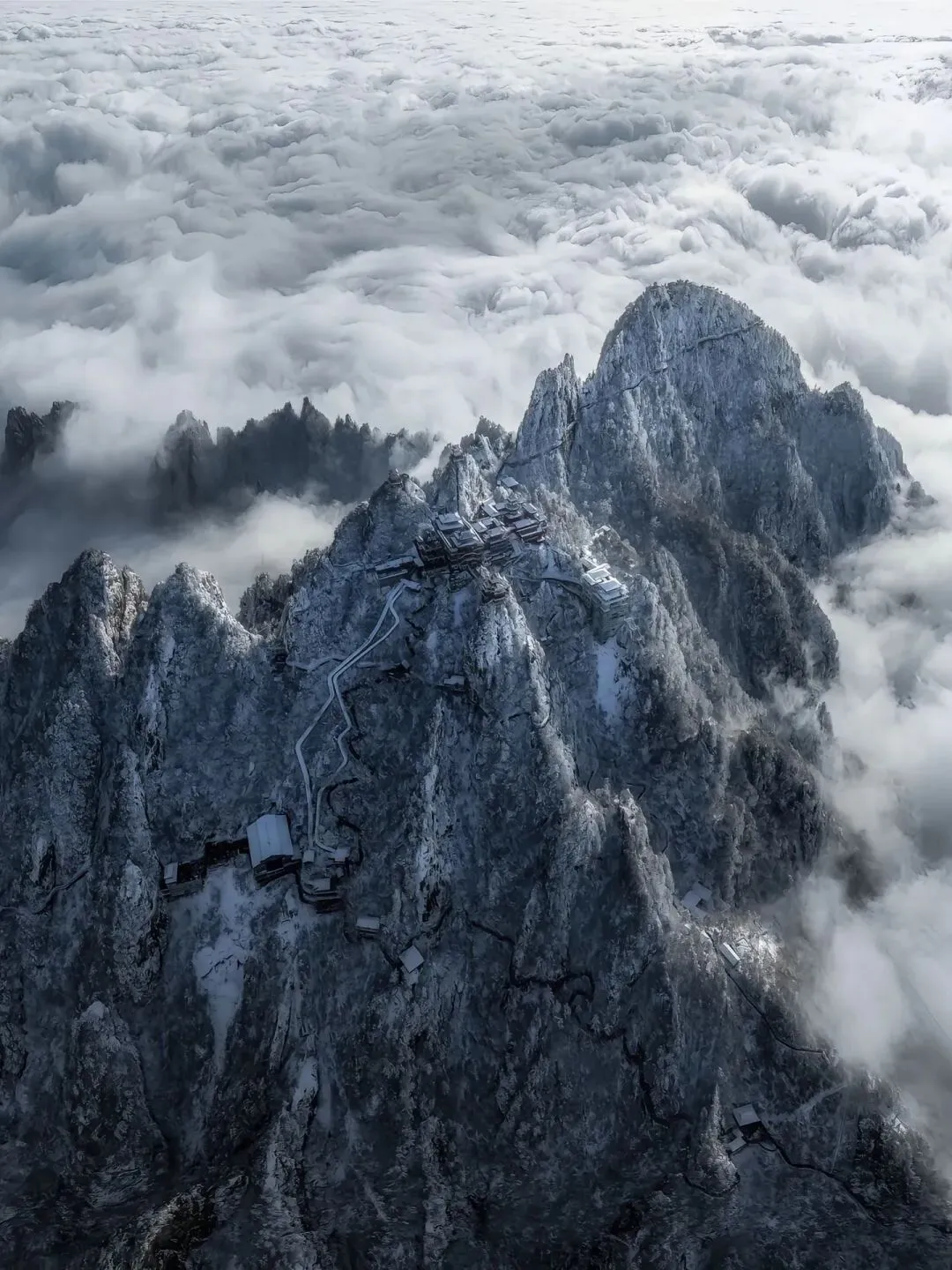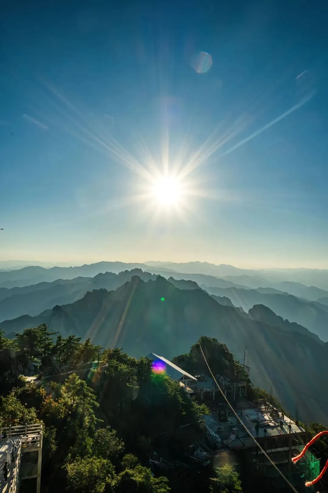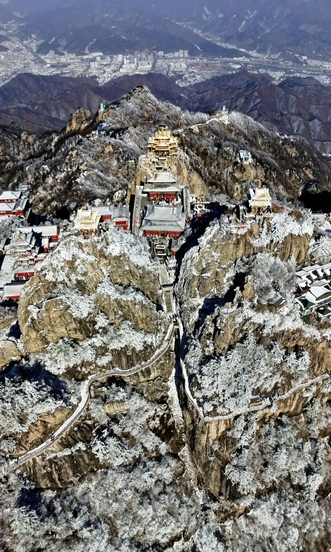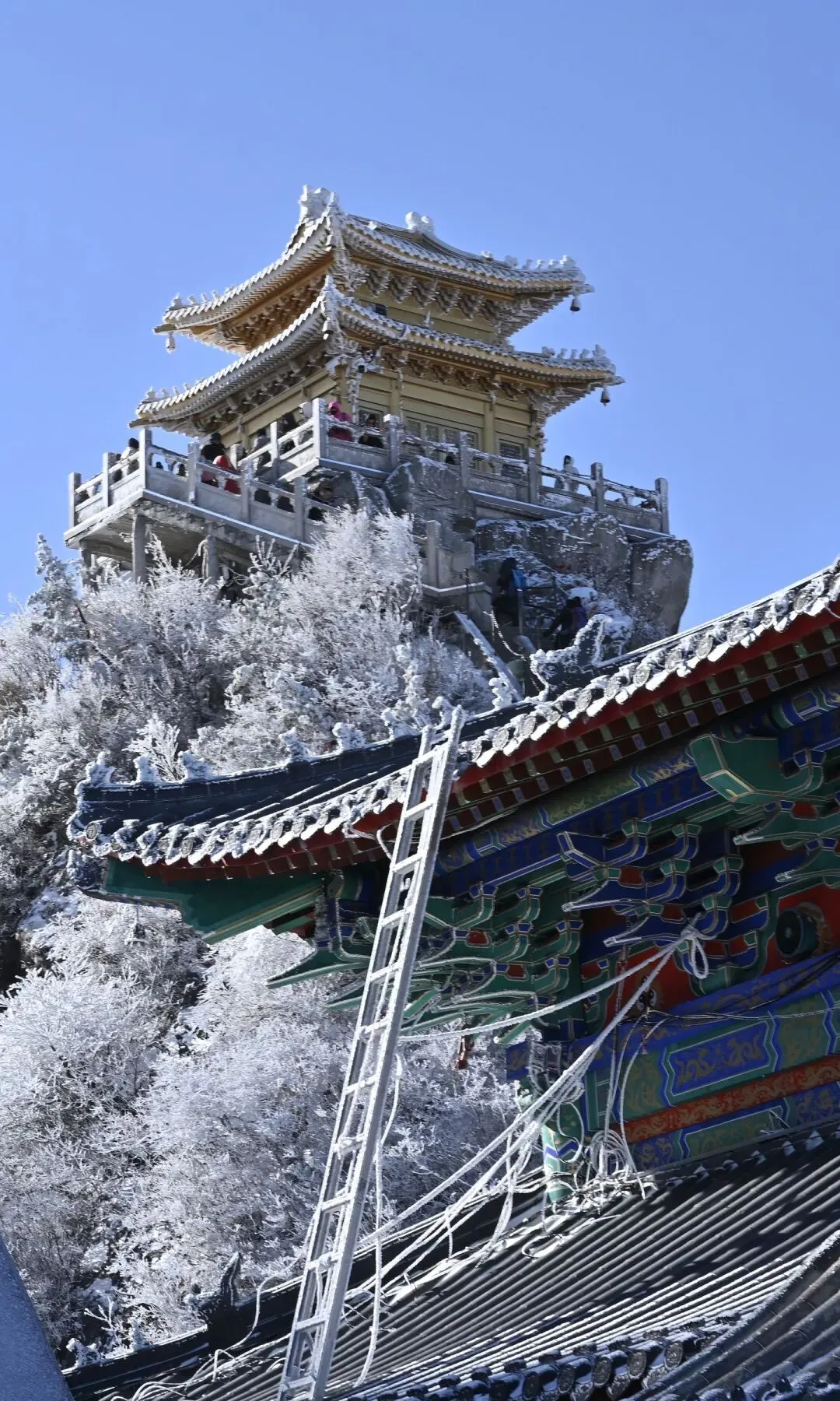 金顶道观群 无疑是老君山的灵魂所在。由金殿、亮宝台、玉皇顶、五母金殿等建筑组成的建筑群,在阳光照射下金光熠熠。