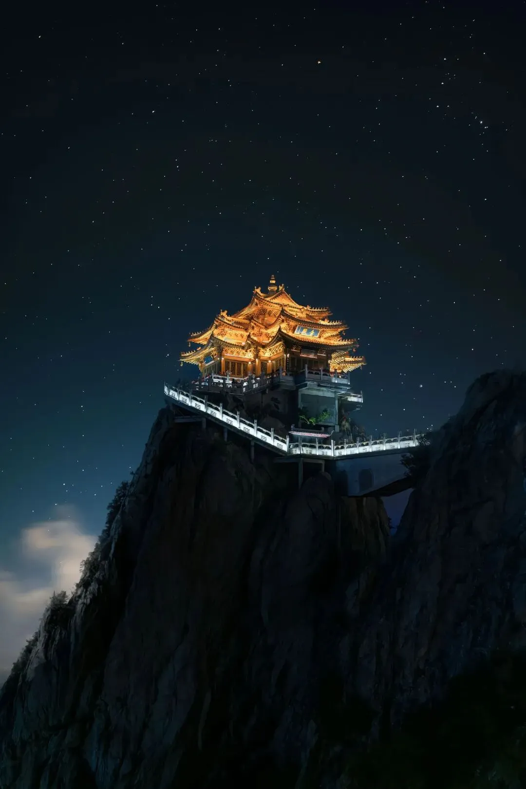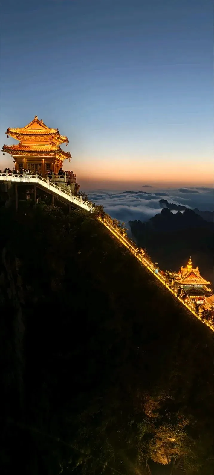 当夜幕降临,金顶道观群的灯光次第亮起,与满天繁星交相辉映,整座山仿佛悬浮于云端的天宫。