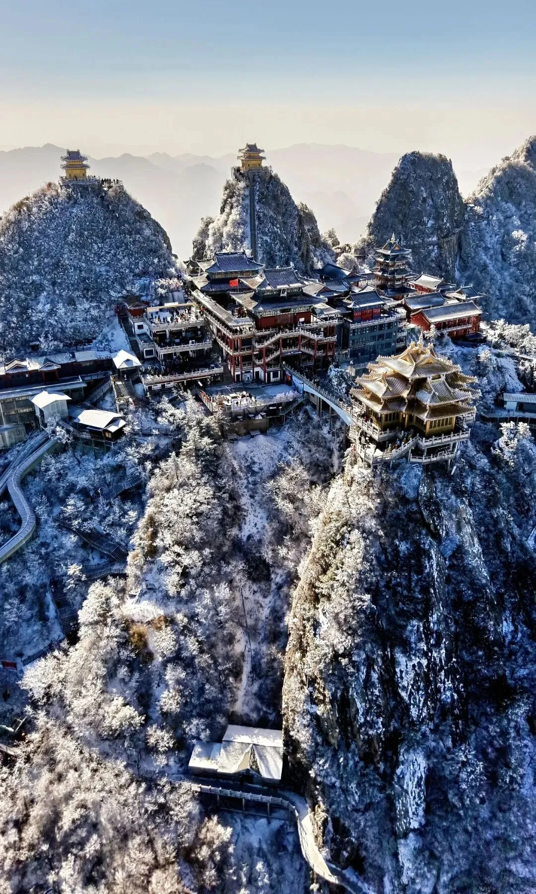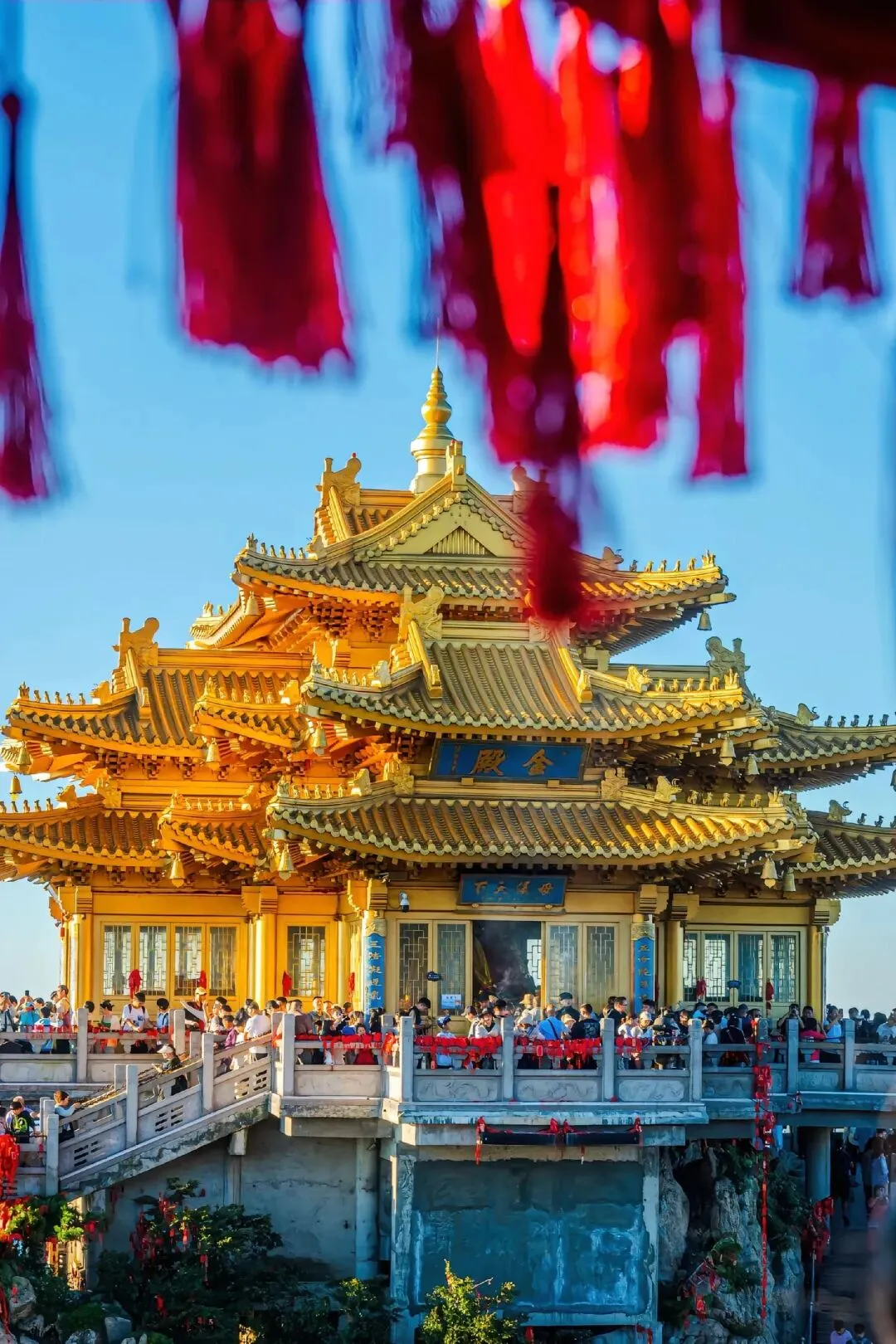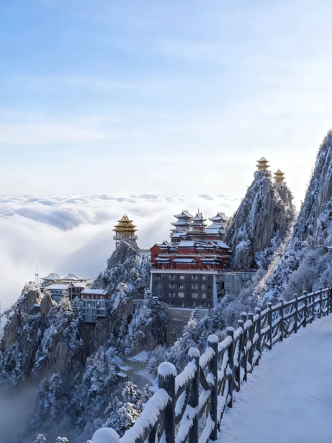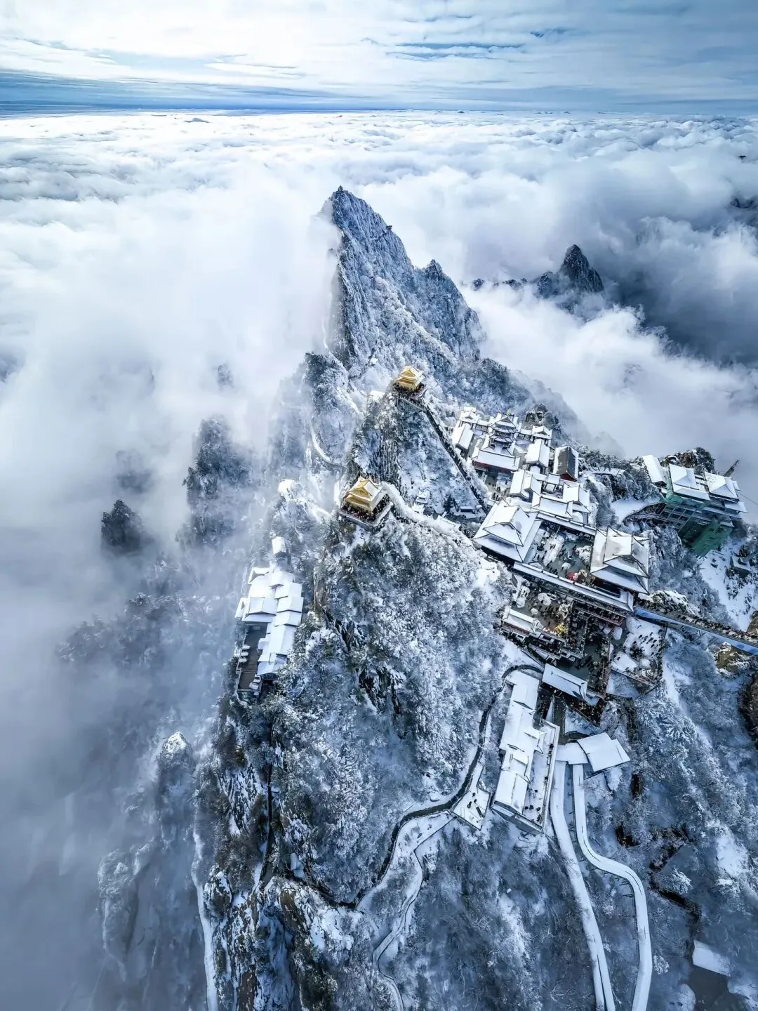 云雾在山巅翻涌,阳光穿透云层洒在金殿之上,2217米的海拔让这里成为离天最近的“道场”。