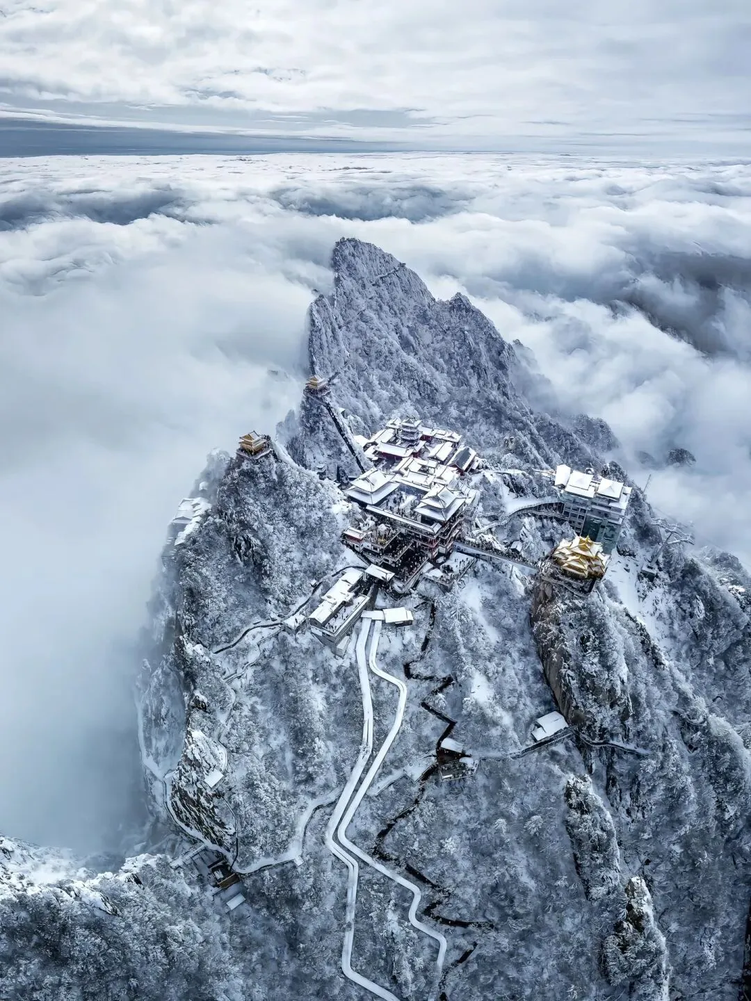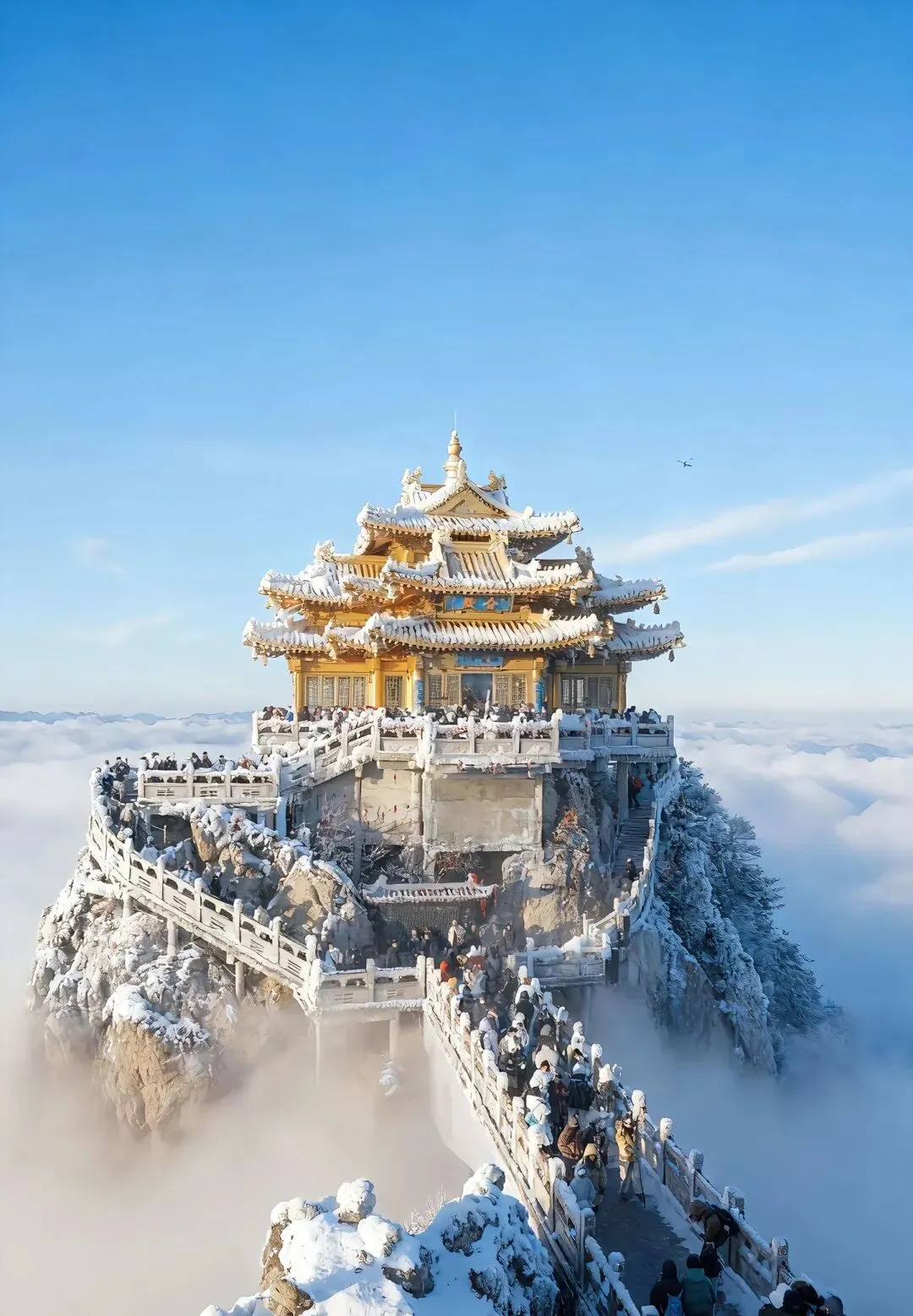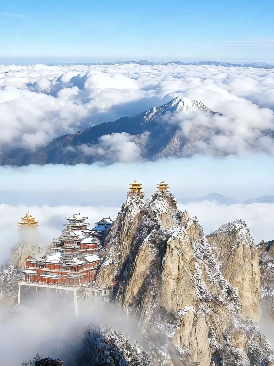 云雾在山巅翻涌,阳光穿透云层洒在金殿之上,2217米的海拔让这里成为离天最近的“道场”。