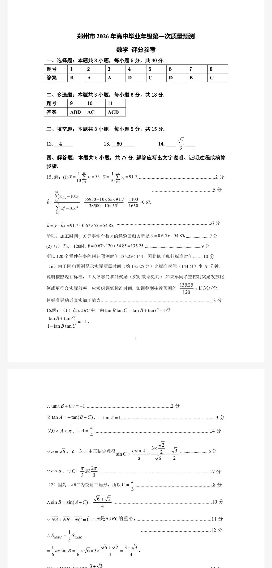 【郑州一模】郑州市2026年高三第一次质量预测答案