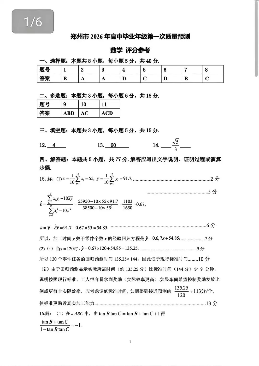 【郑州一模】郑州市2026年高三第一次质量预测答案