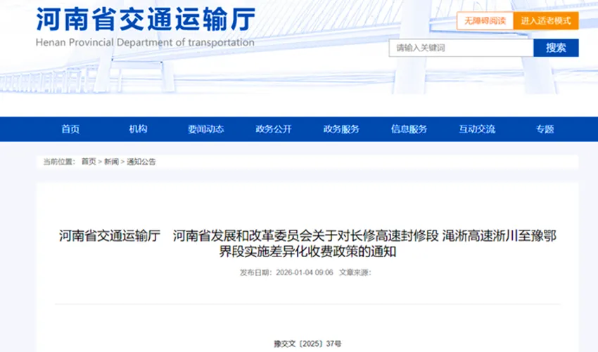 近日,河南省交通运输厅、河南省发展和改革委员会发布通知,对行驶长修高速封修段、渑淅高速淅川至豫鄂界段的货车实行8折通行费优惠,优惠期限为2026年1月1日至6月30日。