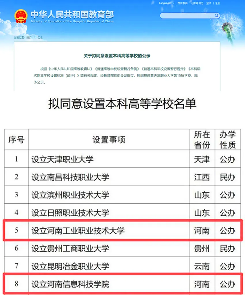 教育部日前官网发布关于拟同意设置本科高等学校的公示,拟同意设置天津职业大学等15所学校。河南省有河南工业职业技术大学、河南信息科技学院两所院校入选。