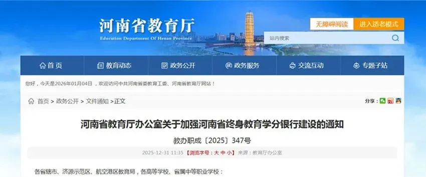 河南省教育厅近日发布通知,进一步加强河南省终身教育学分银行建设。完善符合河南省情的学分银行建设与运行机制,构建以资历框架为基础、以信息化平台为支撑的学分银行制度。