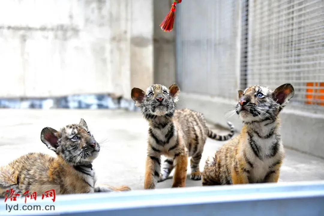 “嗷呜……”昨日,洛阳市王城公园动物园育幼室内传来一阵阵老虎的叫声,3只已满3个月的华南虎幼崽正在嬉戏打闹。