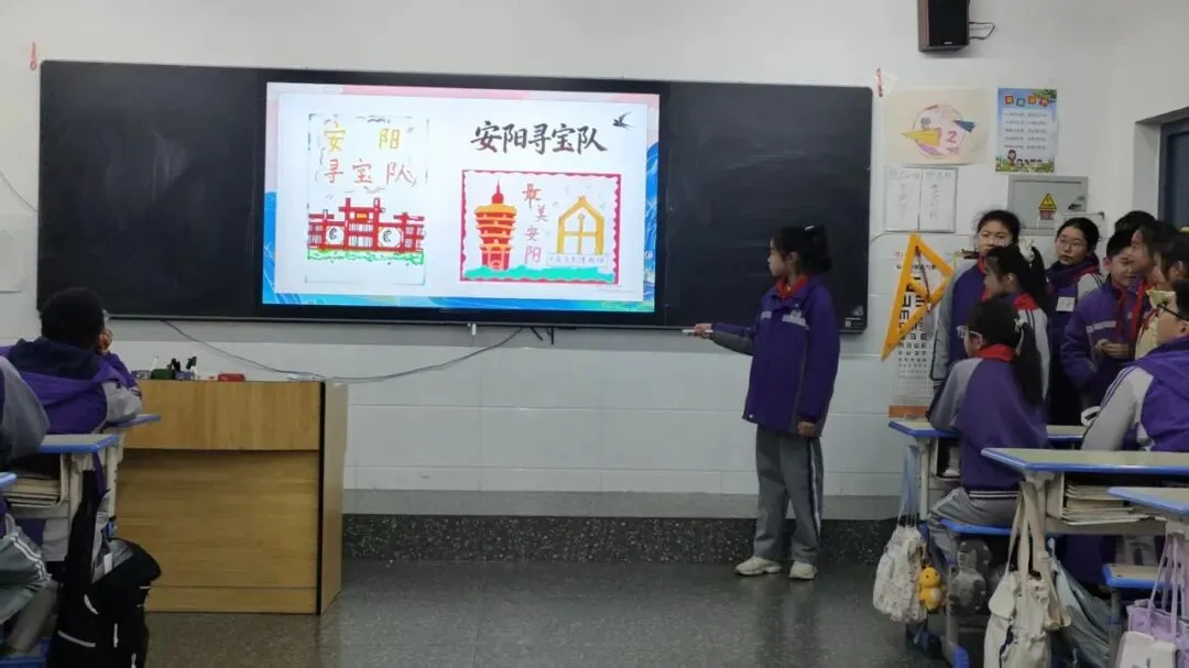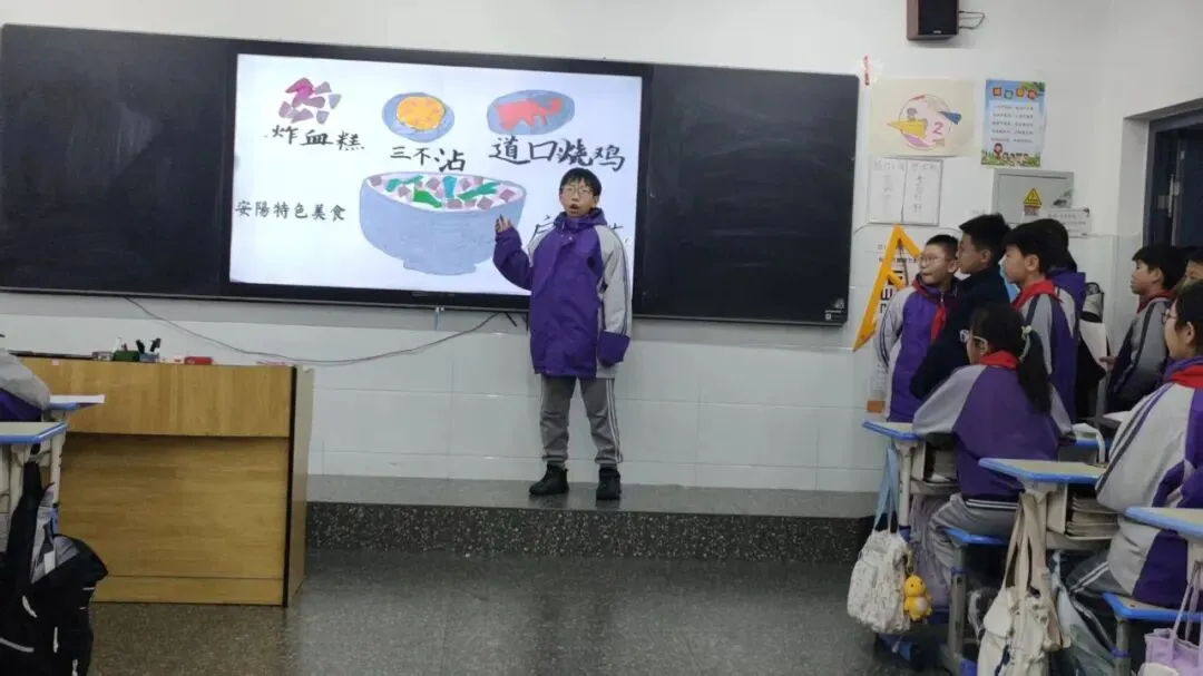 活动展示阶段,各小组以“沉浸式汇报”的形式呈现学习成果。有的小组制作“安阳宣传手册”,用图文结合的方式标注名胜古迹与历史典故;有的小组以“古都名人讲堂”的形式,讲述岳飞、西门豹等先贤的传奇故事;还有的小组将考察见闻转化为文创设计,展示了安阳元素的现代演绎。近两周的筹备过程中,学生们分工协作、自主探究,不仅深化了对家乡文化的理解,更锤炼了沟通表达、创新实践与团队协作能力。