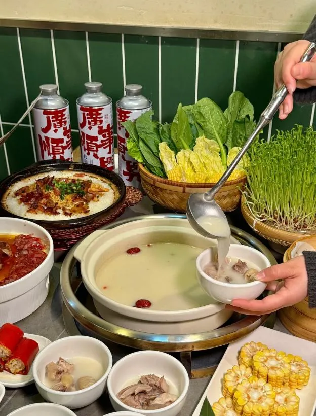 在产品与体验上,廣順興更是下足功夫:以非遗秘方猪肚鸡为核心,搭配广式烧腊、茶点、煲仔饭等经典品类,形成复合产品线,满足家庭聚餐、朋友聚会、轻商务接待等全场景需求。同时,采用明档厨房设计,食材处理、烹饪出品全程透明可见,主打“桌面烹饪”的火锅形式,让食客亲自动手涮煮,既增强了互动体验,更重建了消费者对食材新鲜与烹饪真实的信任。