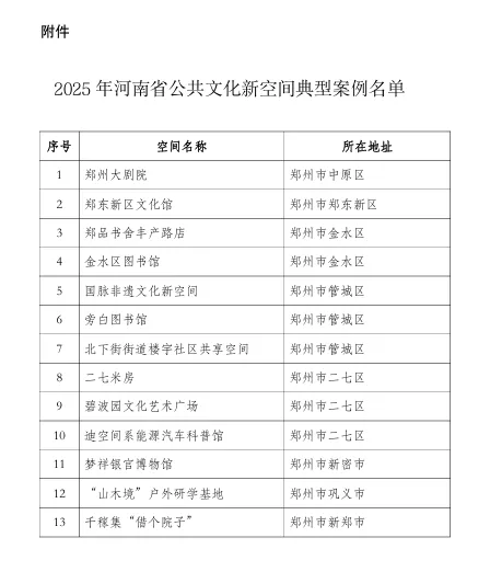 前段时间,根据《关于推荐2025年河南省公共文化新空间典型案例的通知》安排,经各地选拔、推荐,并经过了公示,郑州市有一批2025年河南省公共文化新空间典型案例闪亮诞生了~