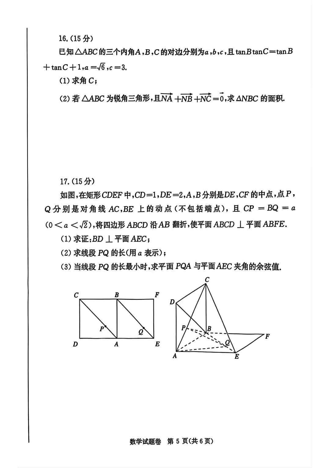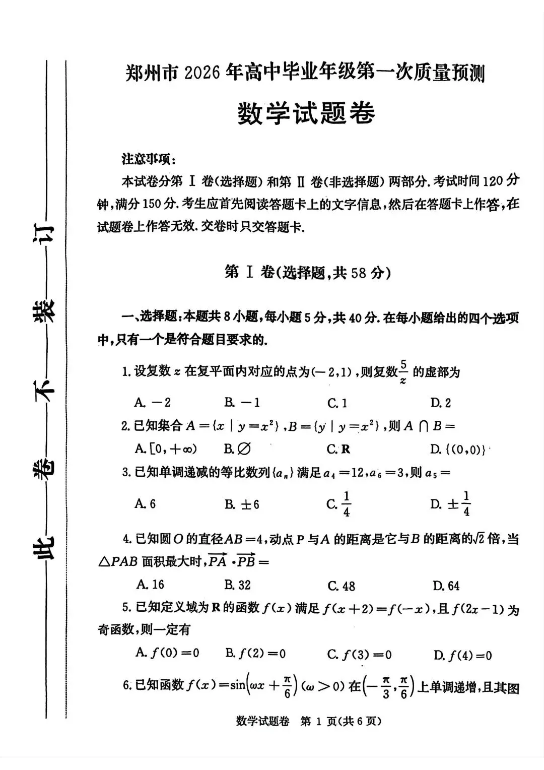 郑州市2026年高中毕业年级第一次质量预测数学试题卷(含答案)