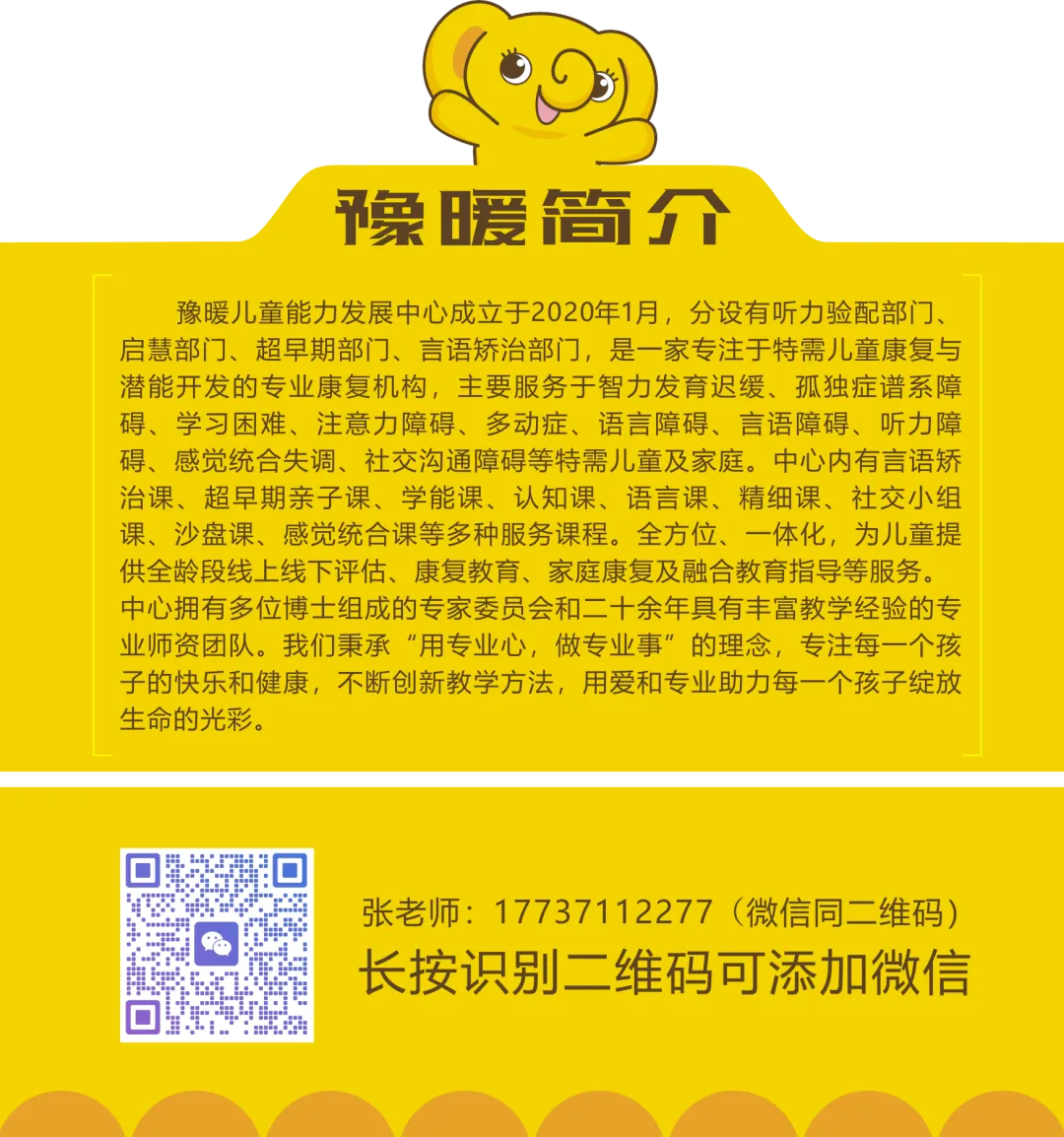 豫暖儿童能力发展中心成立于2020年1月,聚焦听力障碍、孤独症谱系障碍、智力发育迟缓、语言/言语障碍、学习困难、注意力障碍/多动症、感觉统合失调、社交沟通障碍等特需儿童及家庭,兼顾普通儿童潜能开发。