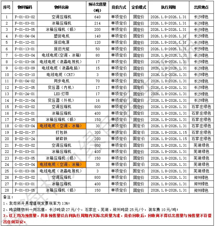 拟对以下物料价格进行竞价,下表中出售量仅供参考,最终数据以我司出售时过磅数量为准。竞价回收后,回收商不得以出售量与预估量不符提出任何异议。