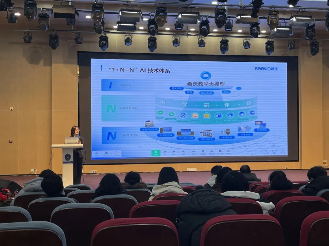 希沃售前工程师马亚亚进一步分享了“希沃AI在教育场景的应用探索”,聚焦希沃教学大模型“1+N+N”AI技术体系,以“场景应用+硬件底座”的双重视角,全面呈现大模型嵌入教、学、研、评、管全流程的应用能力。马亚亚从课前高效备课、课中深度互动到课后个性辅导的全场景切入,细致拆解大模型如何通过希沃AI教学空间、多学科授课工具、AI课堂智能反馈系统等工具矩阵,赋能学生个性化成长与教学提质增效。同时,她详细介绍了希沃第八代交互智能平板及智慧黑板、AI录播、数字孪生平台以及希沃华腾系列等全系列智能硬件终端,带大家了解希沃助力教育数字化背后的底层技术支撑。马亚亚指出,希沃以目标为根本、教师为主导、学生为主体、安全为底线,真正做到让技术回归教学本真,为教育数字化转型注入强劲动能,助力构建更智能、更高效、更公平的教育新生态。