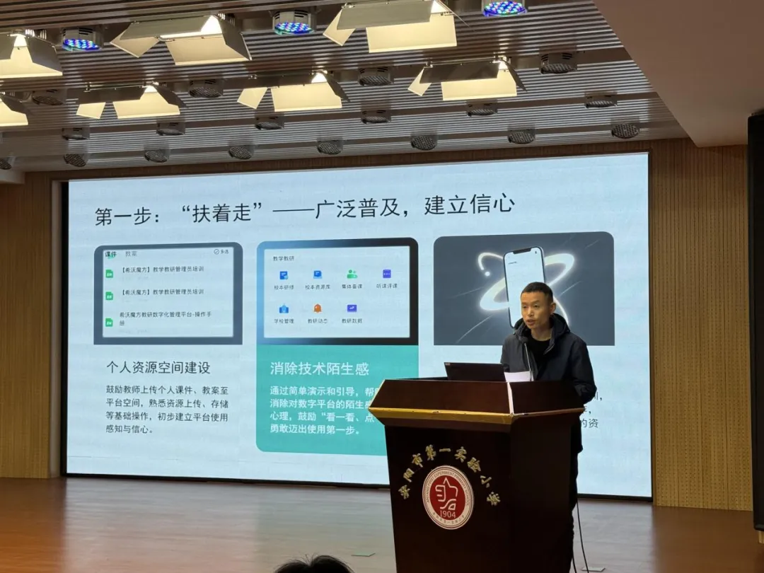 马合朝老师在《深耕常态应用,赋能教学提质——智能研修平台的校本实践和探索》中回溯了学校从接任务到找帮手,再到希沃逐步融入教研日常,推动教研生态改变的过程。马老师介绍,通过前期体验与培训,平台已融入学校单周集体备课、双周听评课等日常教研环节,成为不可或缺的工具,既实现了听评课数字化,又在骨干教师示范下形成带动效应,目前,在全校努力下,教师云课件、云教案、校本资源的数据稳步积累和增长,真正实现成果量化、资源活化、教研持续化。