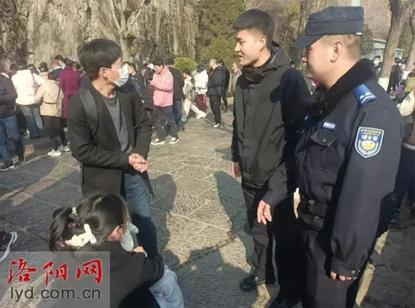 14日,洛阳市公安局特警支队执勤人员在景区维护秩序、服务游客期间,帮助3名走失儿童找到家长。
