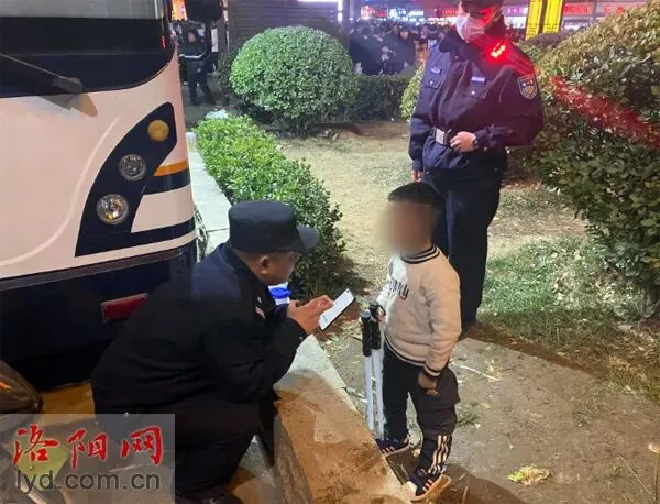 21时25分,特警支队执勤民警尹少坡在洛邑古城巡逻时,发现一名穿着白色上衣的小男孩独自坐在石头墩上,神色慌张,口中喊着“爸爸”。