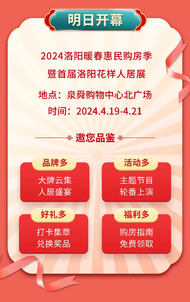 第41届中国洛阳牡丹文化节房产促消费系列活动之重点分项活动——明日(19日),2024洛阳暖春惠民购房季暨首届洛阳花样人居展将在泉舜购物中心北广场开幕。