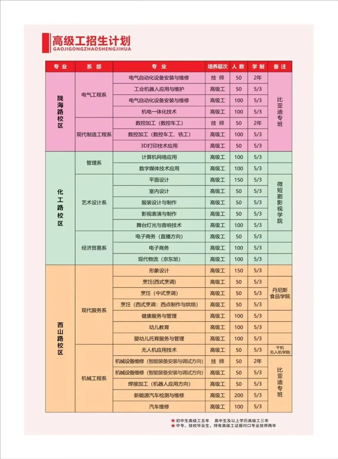 2️⃣ 高级工(专科层次):初中起点5年,高中起点3年,覆盖工业机器人、新能源汽车等24个专业,毕业等同大专学历,可对口升学。