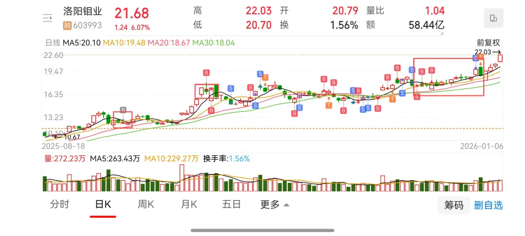 谈到了我对有色的看法。今天这里主要和大家分享下我洛阳钼业的操作。全图如下。