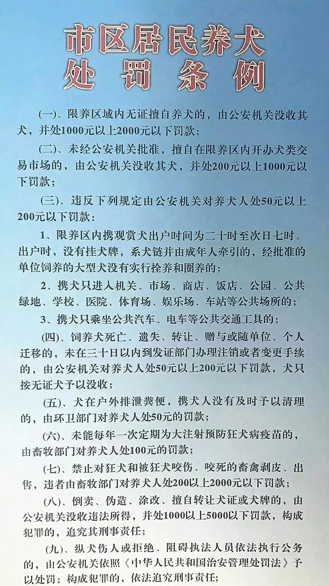 饲养大型犬、烈性犬问题以及无证养犬、不按规定时间遛犬、遛犬不拴链、犬只随地便溺等问题,努力实现公园、广场、风景区、公共绿地、市场、商场、饭店、学校、医院、影剧院、展览馆、火(汽)车站等公共场所没有违规遛犬现象。