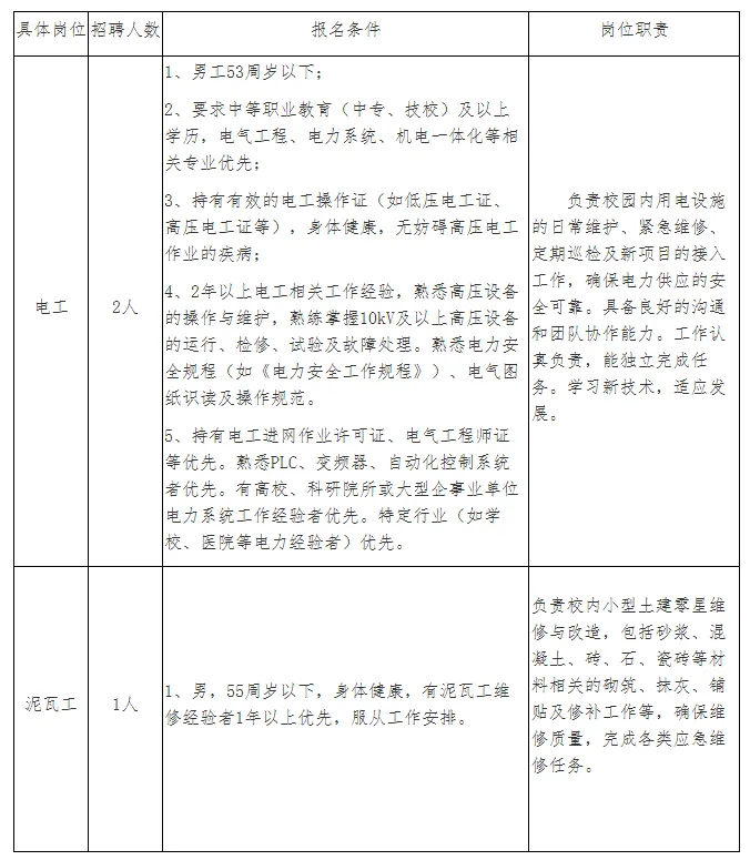 声明:本微信公众号刊载此文,无任何商业目的,目的是架起求职者和用人单位之间的桥梁,传递更多的招聘就业信息。若来源标注错误或侵犯了您的合法权益,请及时与我们联系,我们将及时更正、删除或依法处理,微信号(含:商务合作):xiongcairenli 因工作需要,河南君勤人力资源有限公司现面向社会公开诚聘电工2名、泥瓦工1名,派遣至安阳工学院后勤管理处工作。现将相关事宜公告如下: