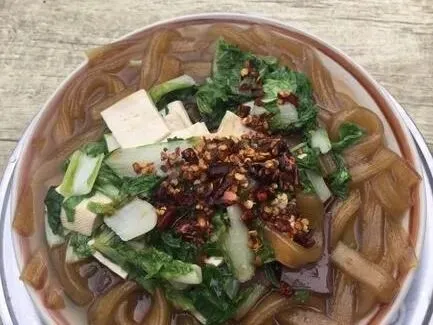 4. 辣椒油为魄:香而不辣的灵魂调味 扁粉菜的辣椒油堪称 “独门绝技”,用盆装着直接放在大铁锅旁,红亮的油光看着就食欲大开。好的辣椒油是 “香而微辣”,用本地辣椒炸制后,连籽带油一起浇在粉菜上,香气瞬间迸发,却不会辣到呛喉,这才是地道风味。