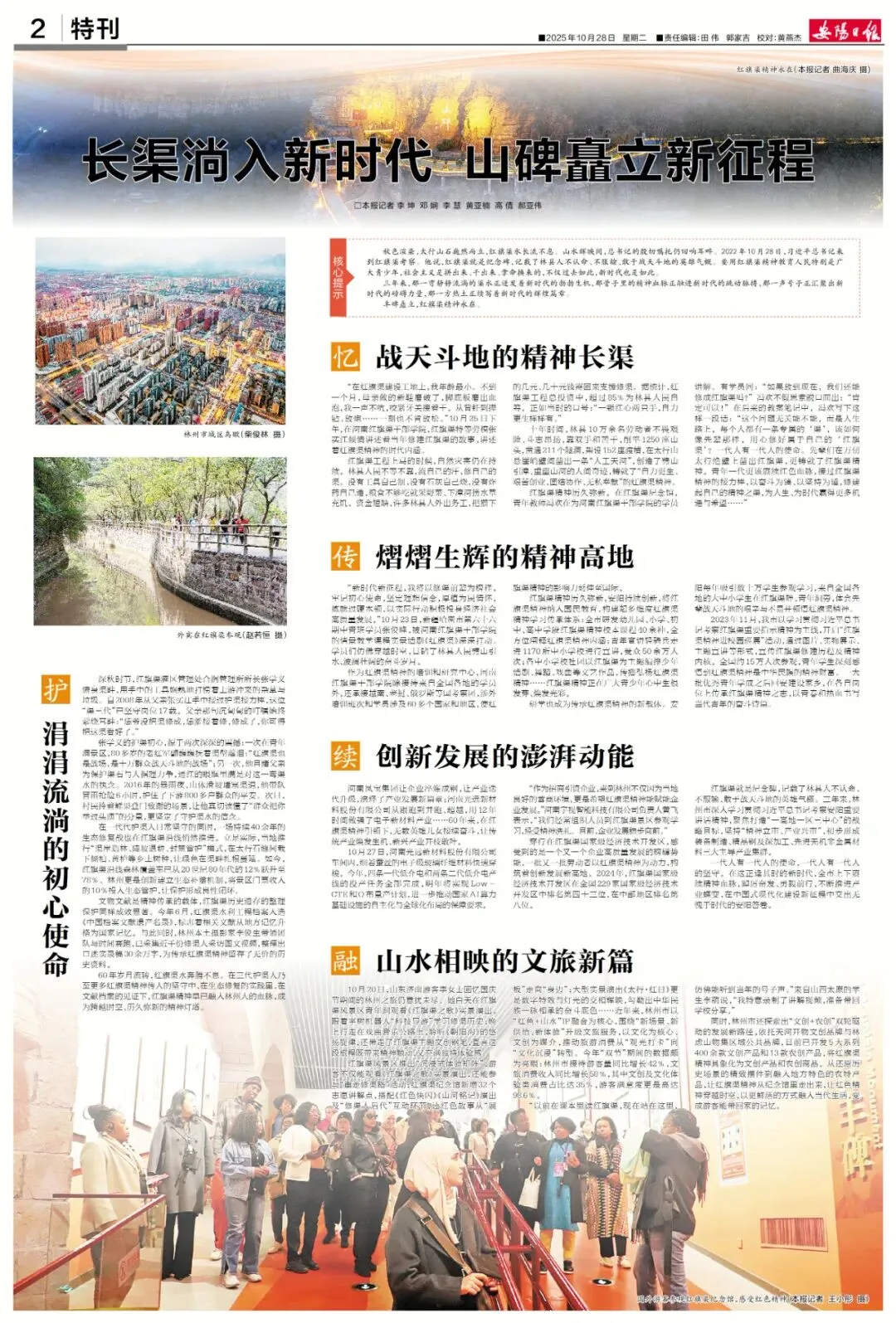 60年岁月流转,红旗渠水奔腾不息。在三代护渠人乃至更多红旗渠精神传人的坚守中、在生态修复的实践里、在文献档案的见证下,红旗渠精神早已融入林州人的血脉,成为跨越时空、历久弥新的精神灯塔。