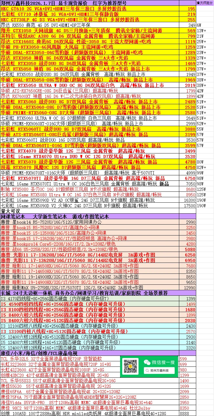 郑州万鑫科技(竞之界商贸)近期显卡和笔记本+液晶电视报价,回复为准