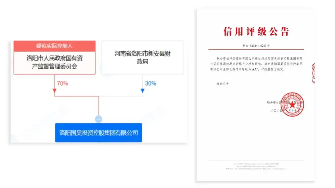 ☀主体:洛阳国昊投资控股集团有限公司(AA+),成立于2017年5月,注册资本50亿元人民币,是新安县整合多家国有平台公司组建而成的大型国有资本投资集团,由洛阳市国资委(持股70%)和新安县财政局(持股30%)。主体信用评级AA+,控股子公司127家,主营业务覆盖投资、基建、地产及文旅等领域,是推动当地经济高质量发展的重要平台。截至2024年末,集团资产规模达460.48亿元,净资产260.14亿元,营收35.65亿元,负债率为43.51%。
