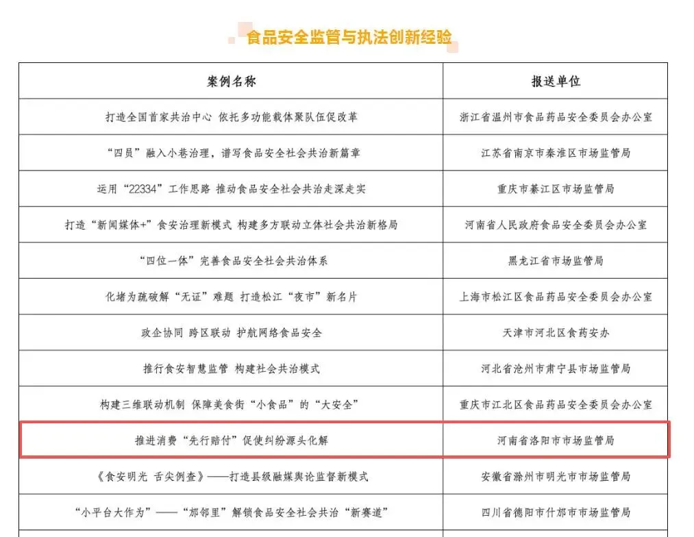 在市场监管总局食品协调司的指导下,中国工商出版社于2025年4月开展了“第三届食品安全社会共治典型案例征集活动”,经组织专家多轮评审,并报市场监管总局相关司局审核把关,最终根据16种案例类型遴选出覆盖6大领域的92个典型案例。其中,洛阳市市场监管局报送的《推进消费"先行赔付"促使纠纷源头化解》入选食品安全监管与执法创新经验典型案例。洛阳市市场监管局积极探索“政府引导、企业主责、社会协同、无忧消费”的维权新路径,着力解决食品安全消费维权难、赔付慢等问题,在全市初步建立消费投诉“快速受理—调查核实—先行赔付—责任追溯”工作流程,实现了消费投诉“小事不出店、大事不出场、纠纷不过夜”的“无忧消费”。目前,全市54家商场、市场、超市、景区等场所与1000余家食品生产经营者签订了消费者投诉先行赔付协议或承诺书。