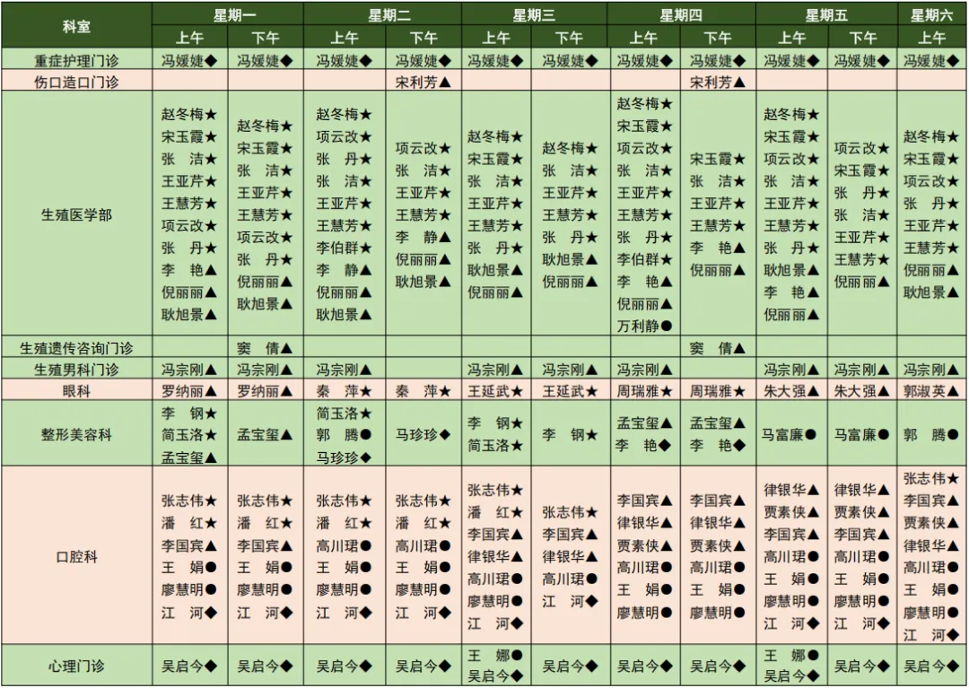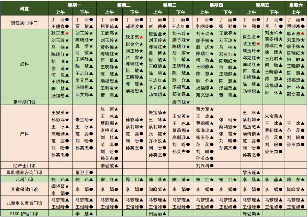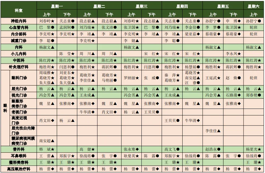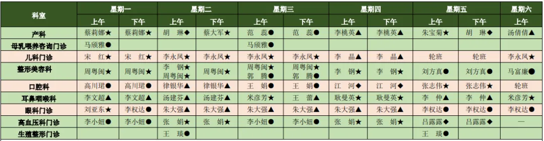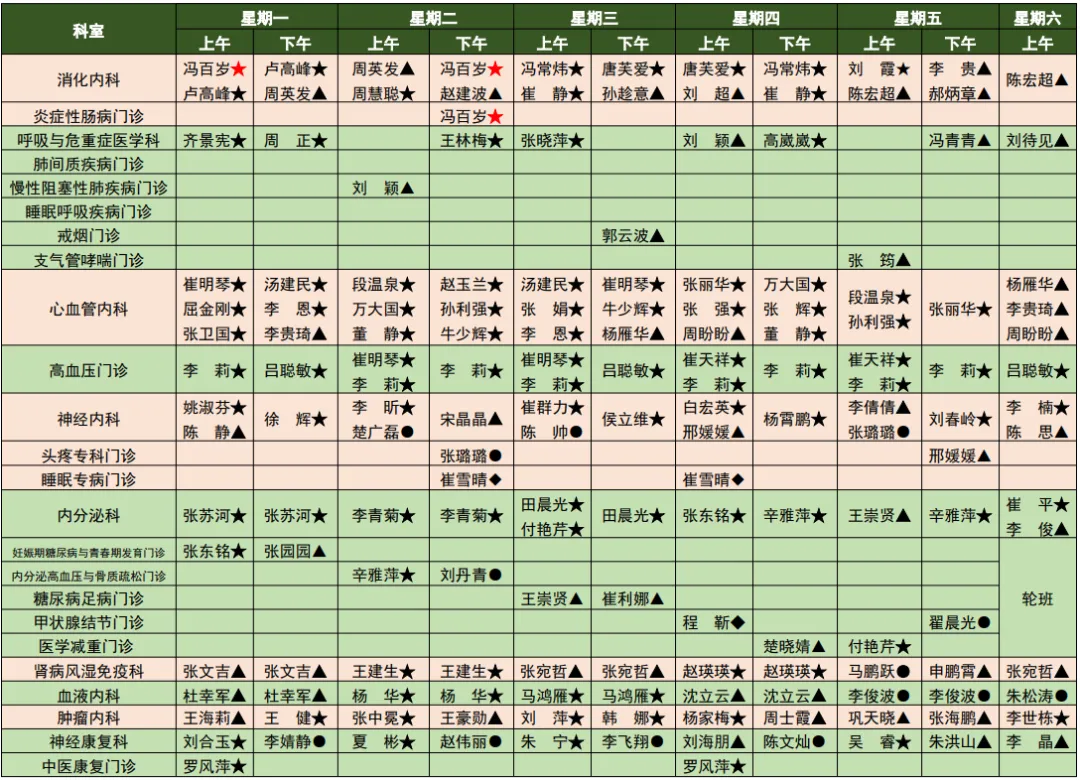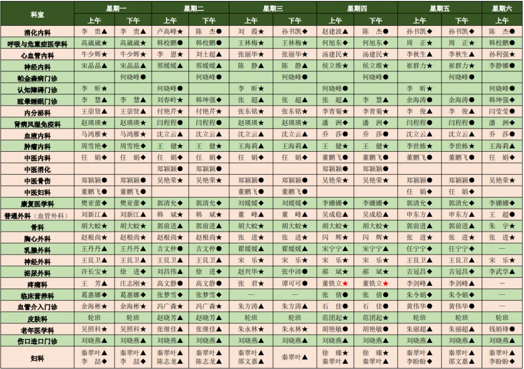 我院医师肩负着外出会诊、学术活动、教学、外出进修、出国学习、下乡等任务,门诊出诊以当天出诊医师为准,此表仅供参考。