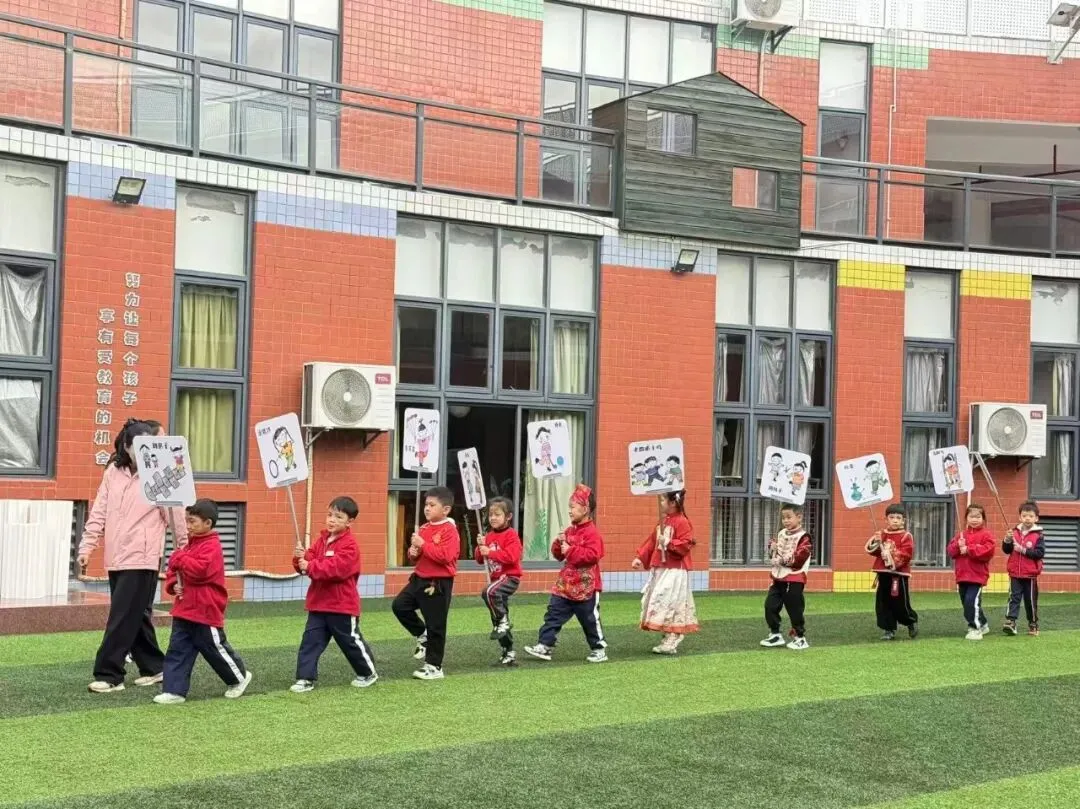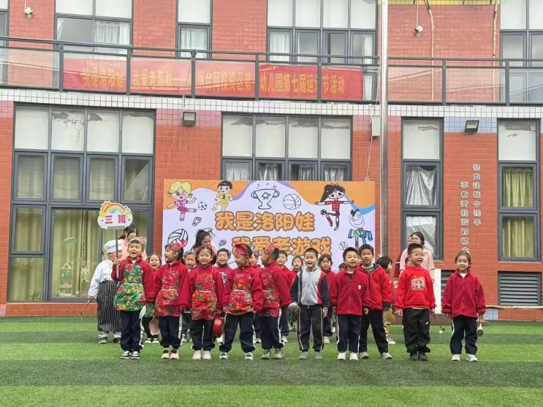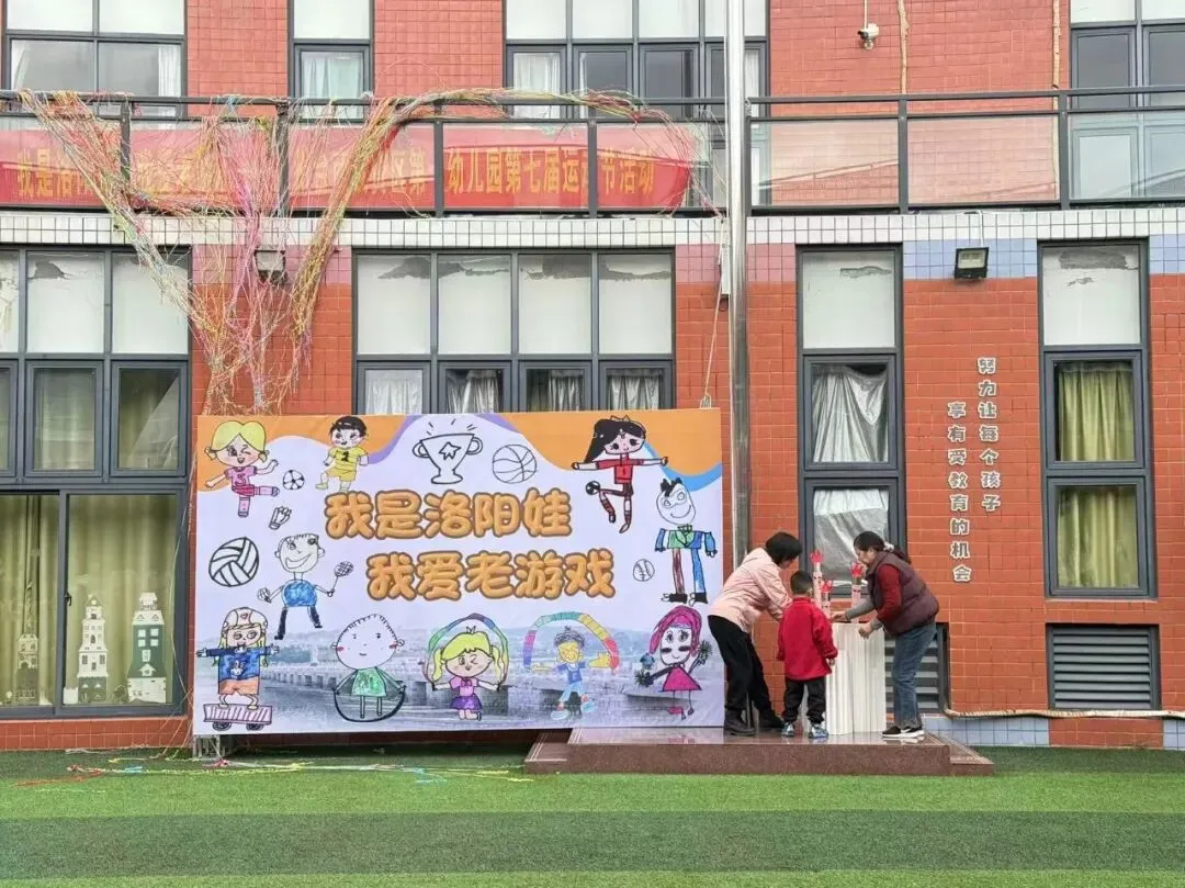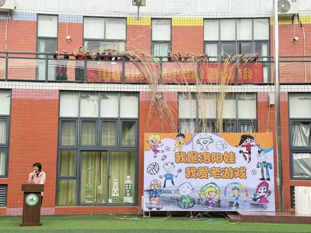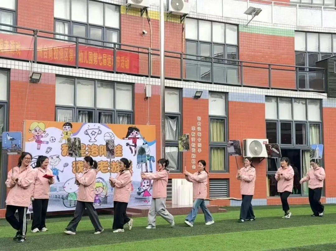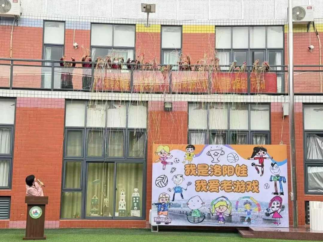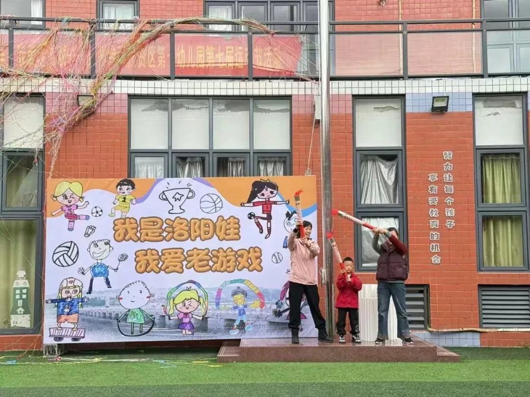 其次幼儿代表方阵入场,孩子们手持精心绘制的民间游戏主题画板,迈着整齐又稚嫩的步伐缓缓入场。画板上,斗鸡、老鹰捉小鸡、耍花盘等经典老游戏场景栩栩如生,色彩鲜艳的笔触间满是孩子们对传统游戏的喜爱。同时齐声喊出响亮的口号:“我是洛阳娃,我爱老游戏!”稚嫩却有力的声音回荡在学园上空,既展现了洛阳娃的精神风貌,也道出了对民间传统游戏的热爱与传承之情。