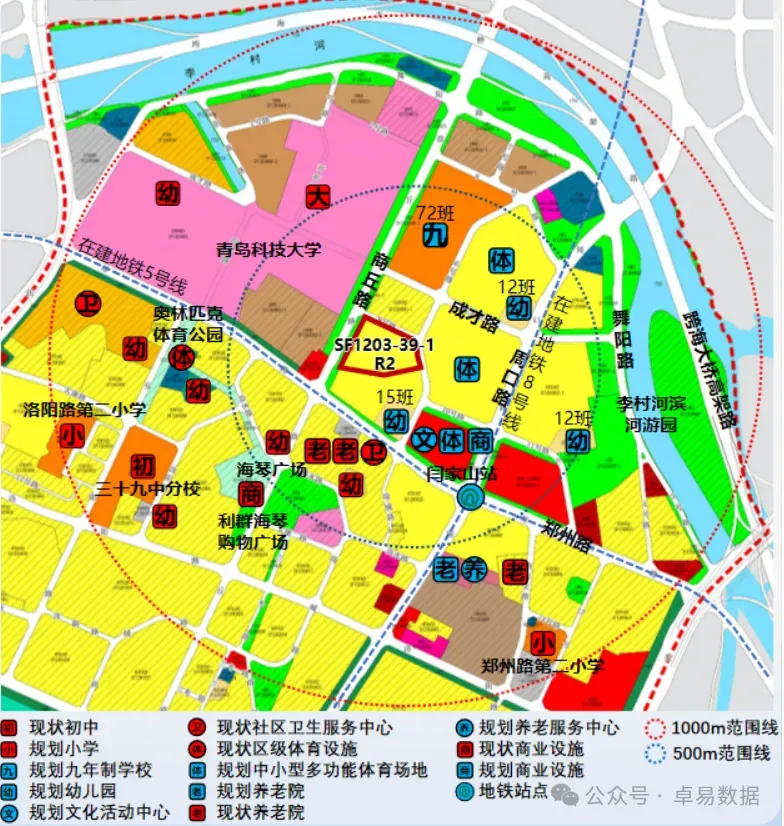 2.教育与医疗:现状周边有青岛科技大学、三十九中市北分校、郑州路第二小学、洛阳路第二小学、现状幼儿园6处、社区卫生服务中心2处,规划周边有九年制学校1处、幼儿园3处;
