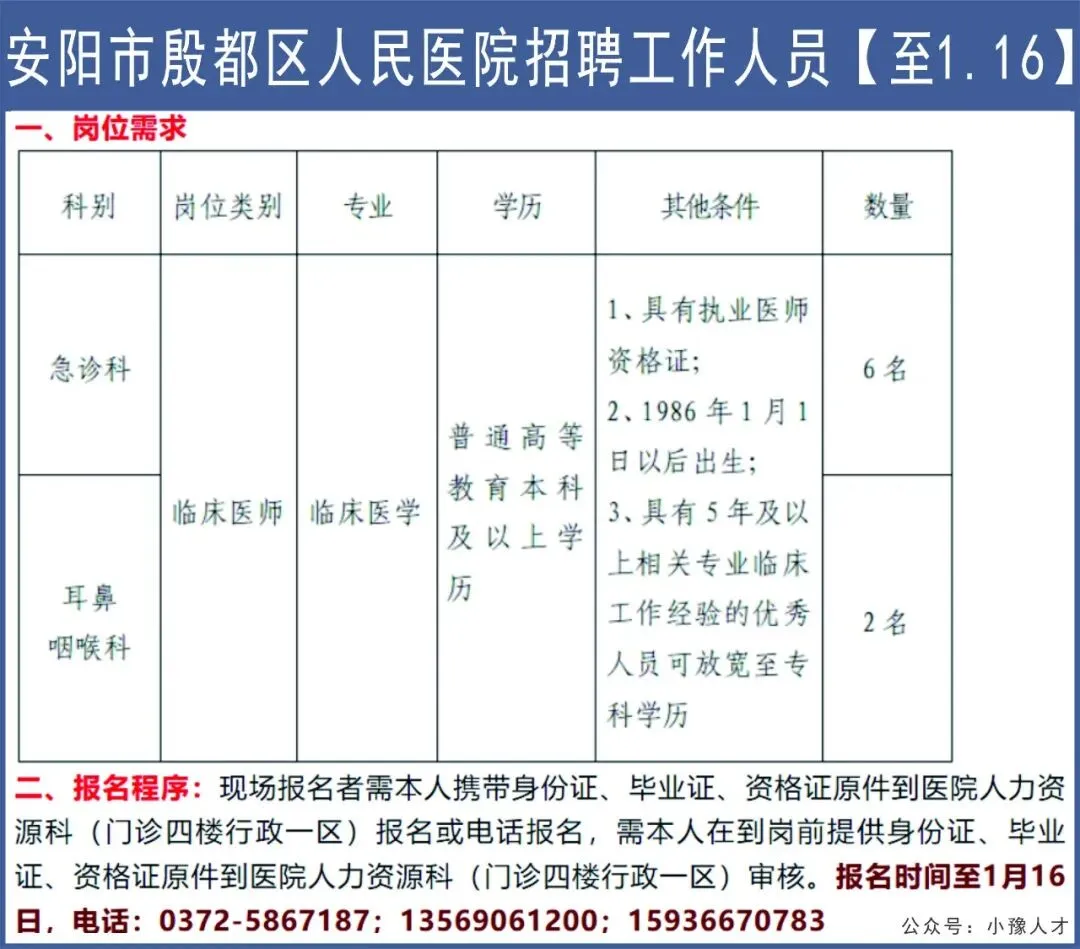 >安阳市殷都区人民医院招聘工作人员【至1.16】