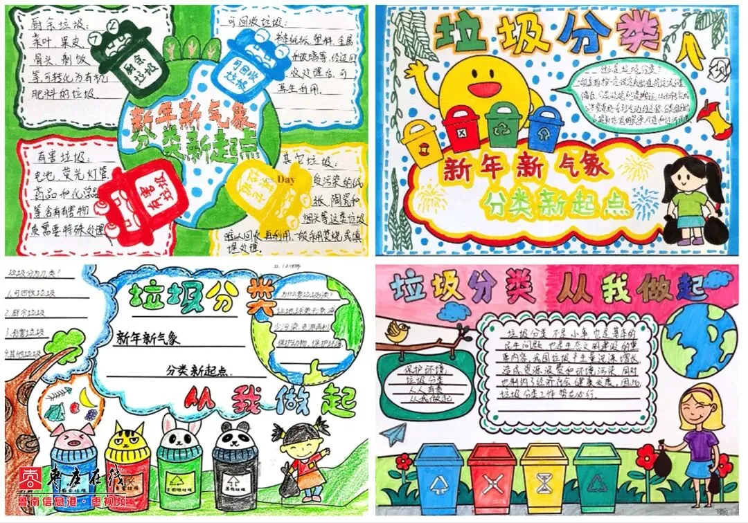 随后,学生们化身“环保小设计师”,创作垃圾分类手抄报。作品里既有清晰的垃圾投放指南,又融入烟花、福字等新年元素,让严谨的分类知识裹上了新春的活泼气息。