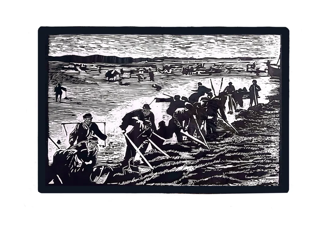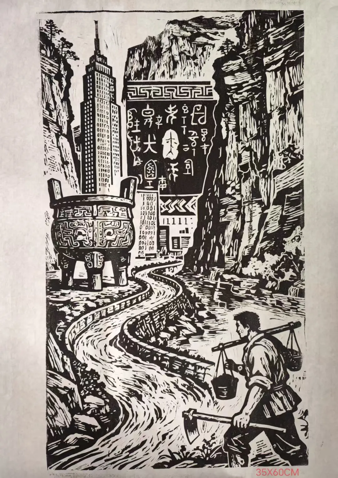 王一闯 《河畔夯歌.同心筑梦》木刻画180x80cm