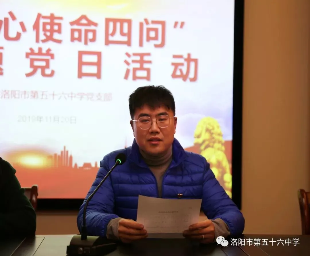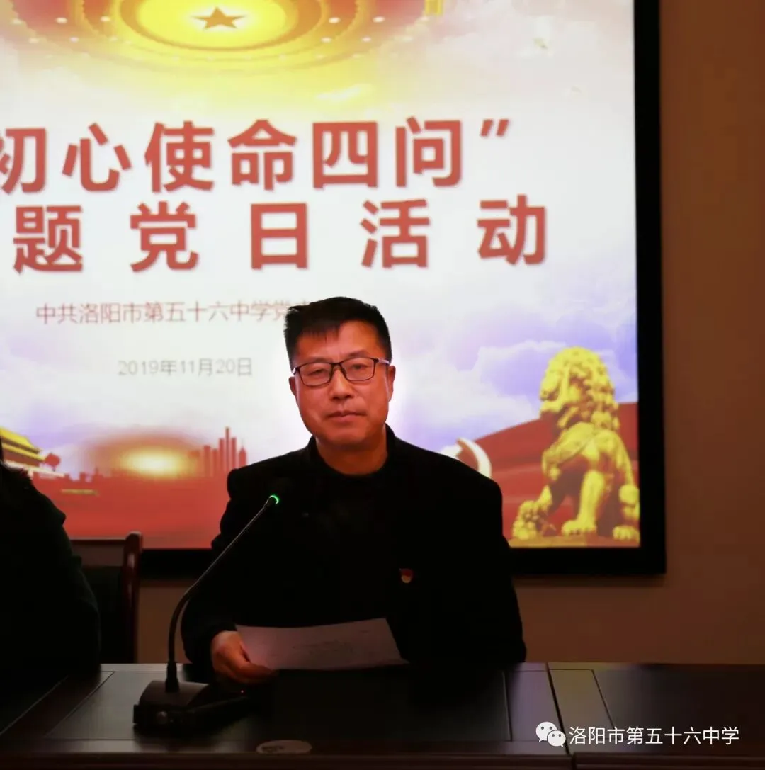 为认真学习贯彻习近平总书记视察调研河南时的重要讲话精神,推动“不忘初心 牢记使命”主题教育走深走实,2019年11月20日下午,我校在三楼会议室开展现“初心使命四问”主题党日活动。活动由副校长徐冰主持。