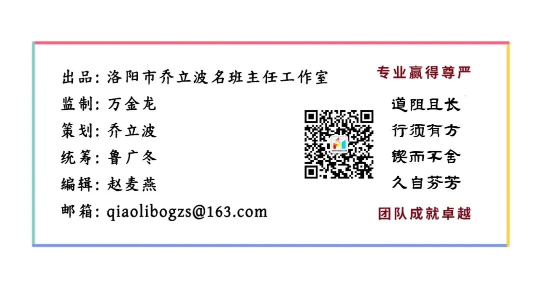 洛阳市乔立波名班主任工作室自成立以来,始终秉持“专业赢得尊严,团队成就卓越”的建设理念,以“培养研究型专家班主任”为核心目标,以“培养能登台讲座分享、传播带班育人智慧的名班主任”为特色,以“引领辐射、示范带动”为使命,扎实推进工作室的日常工作。经过四年的探索与实践,工作室已经发展为班主任成长的专业平台,历练成优秀班主任的孵化器。