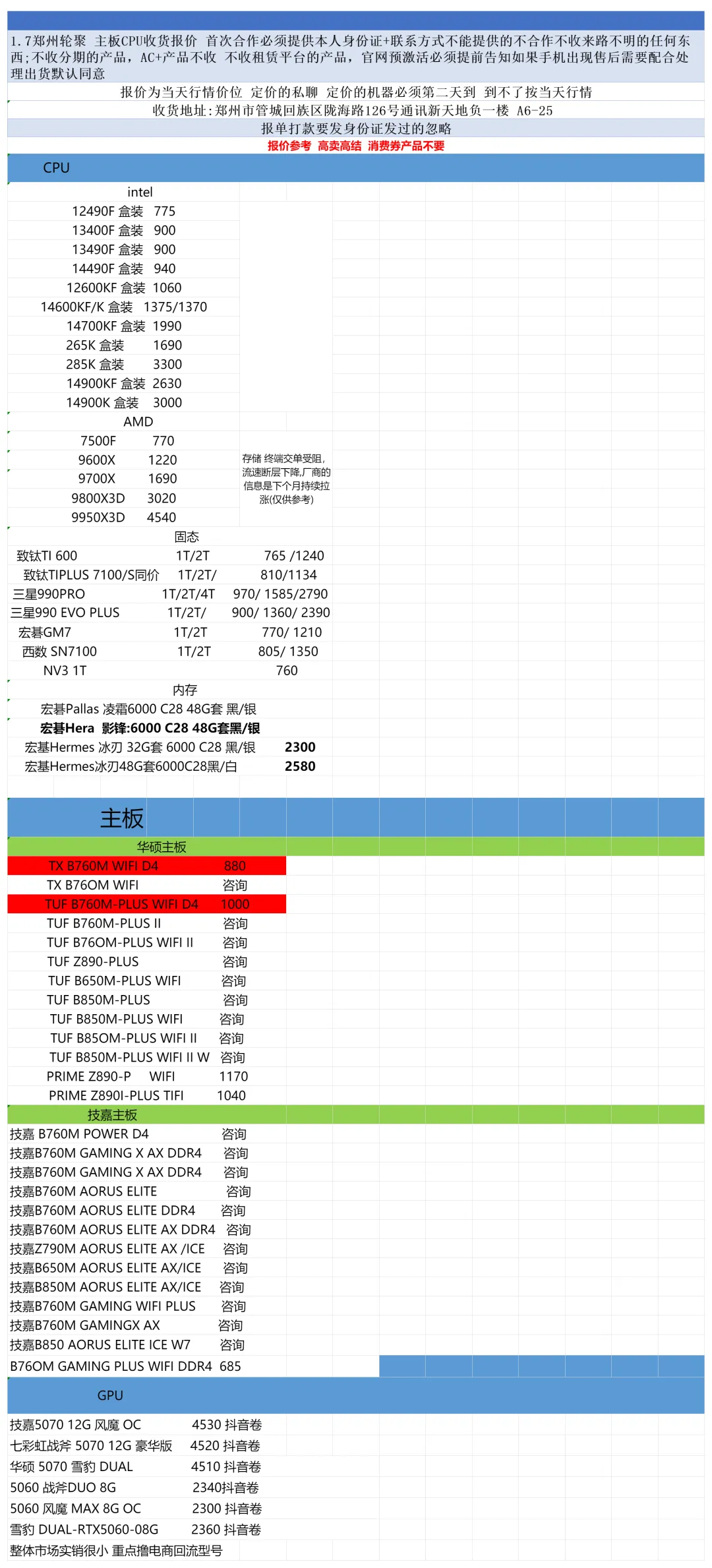 >郑州轮聚通讯 2026年1.7日数码报价更新