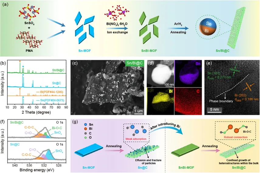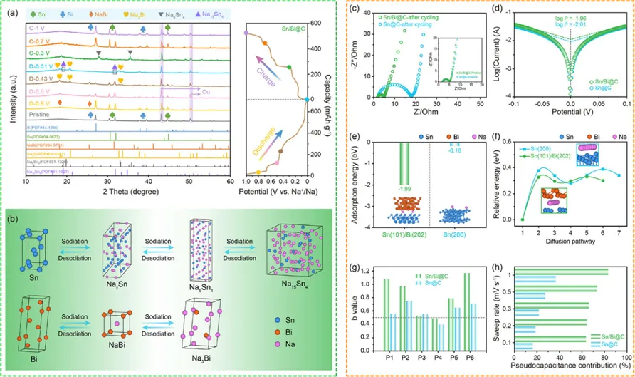 材料制备过程,通过形成Sn/Bi异质结构和强键合作用的Bi-O-C键,抑制纳米颗粒溢出,保障结构完整性。钠化过程中,借助复杂相转变和异质结构,促使Sn合金原位纳米化,抑制纳米颗粒自发团聚,缩短电子/离子传输路径。