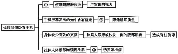 22.小明根据文章内容制作了一张思维导图,阐明了长时间侧卧看手机的危害。请你将这份思维导图补充完整,每处不超过12个字。(6分)