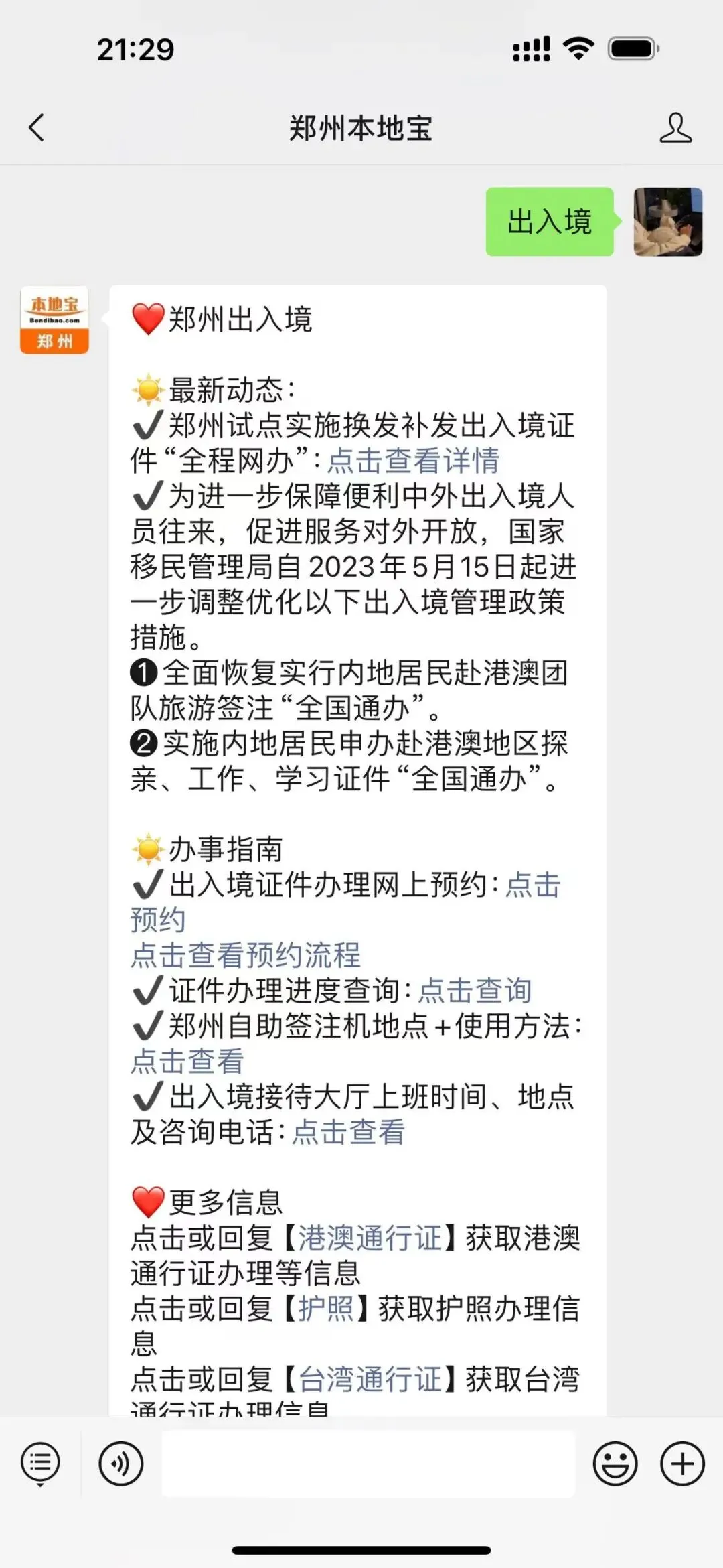 在对话框回复【出入境】即可获取办理入口