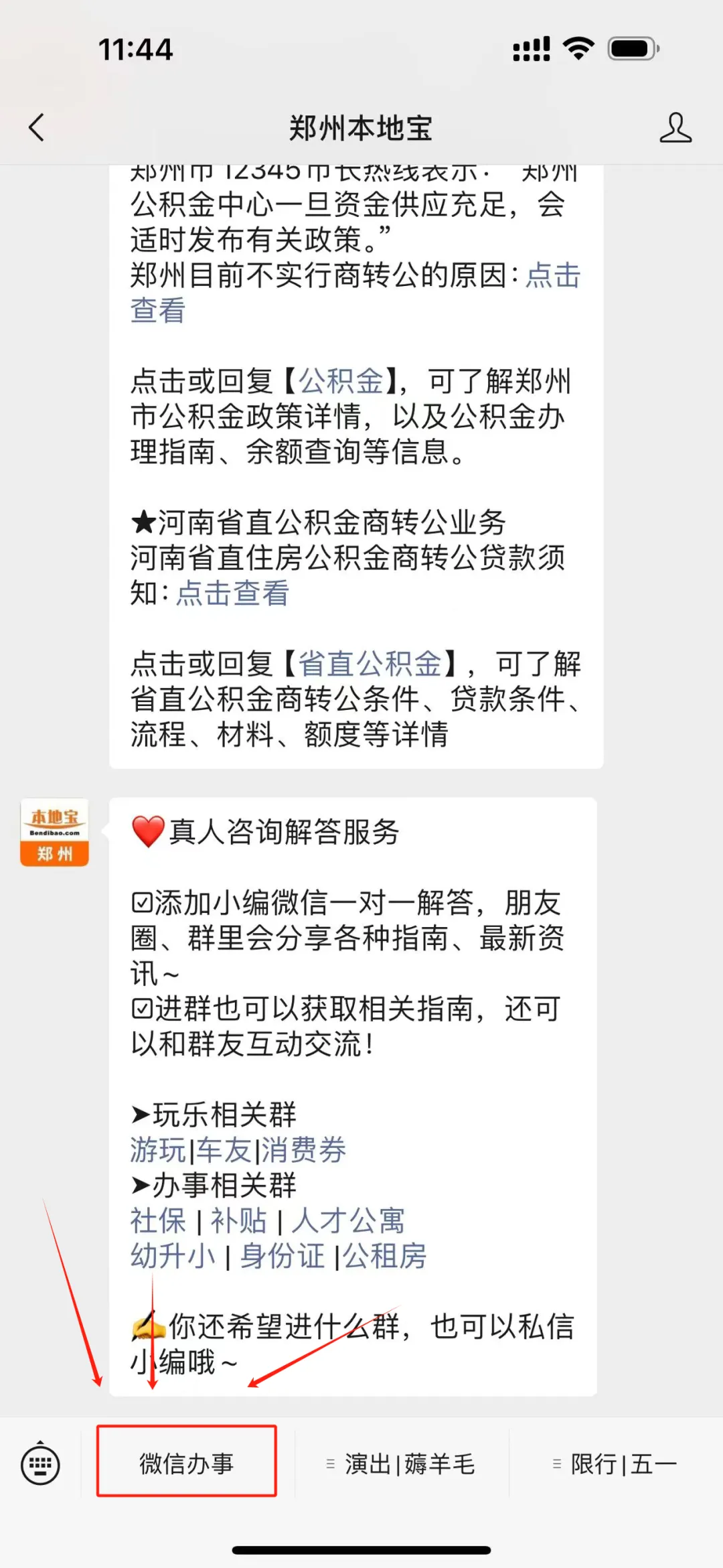 ➤可以在下方菜单栏点击微信办事,演出|薅羊毛,限行|五一获取你想看的内容: